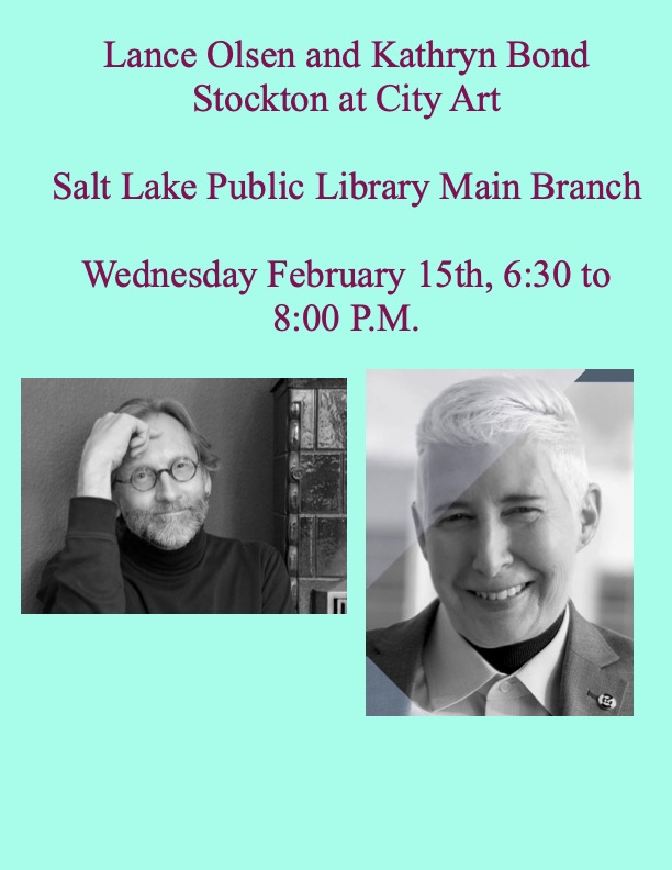 Lance Olsen and Kathryn Bond Stockton at City Art Salt Lake Public Library Main Branch 210 East 400 South Salt Lake City UT 84111 Wednesday February 15th, 6:30 to 8:00 P.M. Authors Lance Olsen and Kathryn Bond Stockton will read from their work, February 15th, at the Salt Lake City Public Library at 6:30 P.M. as part of the City Art Reading Series. Lance Olsen is author of more than 30 books of and about innovative writing, including, most recently, the novels My Red Heaven (Dzanc, 2020) and Skin Elegies (Dzanc, 2021). His short stories, essays, and reviews have appeared in hundreds of journals and anthologies, such as Conjunctions, Black Warrior Review, Fiction International, Village Voice, BOMB, McSweeney’s, and Best American Non-Required Reading. A Guggenheim, Berlin Prize, D.A.A.D. Artist-in-Berlin Residency, Rockefeller Bellagio Center, Pushcart Prize, and two-time N.E.A. Fellowship recipient, as well as a Fulbright Scholar (Finland), he teaches experimental narrative theory and practice at the University of Utah.Joel Long’s book Winged Insects won the White Pine Press Poetry Prize. Lessons in Disappearance (2012) and Knowing Time by Light (2010) were published by Blaine Creek Press. His chapbooks, Chopin’s Preludes and Saffron Beneath Every Frost were published from Elik Press. His poems and essays have appeared in Gettysburg Review, Sports Literate, Prairie Schooner, Bellingham Review, Rhino, Bitter Oleander, Massachusetts Review, Terrain, and Water-Stone Review, among others. He has essays forthcoming in Interim and Ocean State Review. Kathryn Bond Stockton is Distinguished Professor of English, former Associate Vice President for Equity and Diversity, and inaugural Dean of the School for Cultural & Social Transformation at the University of Utah, where she teaches queer theory, theories of race and racialized gender, and twentieth-century literature and film. Two of her books—Beautiful Bottom, Beautiful Shame: Where “Black” Meets “Queer” and The Queer Child (Duke University Press)—were national finalists for the Lambda Literary Award in LGBT Studies. In addition, her recent book Making Out (NYU Press) was a 2020 national finalist for the Next Generation Indie Book Award for memoir. Her forthcoming book (with MIT Press) is entitled Gender(s) and she has also authored God Between Their Lips (Stanford University Press). Stockton has taught at Cornell University’s School of Criticism and Theory and, along with her university’s top teaching award, she has received the Equality Utah Allies Award for LGBT activism, the NOW Lifetime Achievement Award, the YWCA Outstanding Achievement Award in Arts and Communication, the Crompton Noll Prize for Best Essay in Gay and Lesbian Studies from the Modern Language Association, and the Rosenblatt Prize for Excellence, the highest honor granted by the University of Utah . | | | | | | | | | | | Kathryn Bond Stockton – Rosenblatt Prize | | | Most featured readings are followed by an open reading. City Art is sponsored by the Utah Arts Council, the Salt Lake City Arts Council, Catalyst, the Salt Lake City Public Library, Xmission, and the Zoo, Arts, and Park Fund. Joel Long