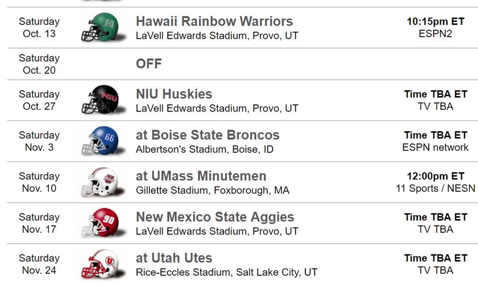 HB Arnett's "Lite" <mailto:hbarnett@fiber.net> hbarnett@fiber.net 801 372 0819 Vol. 38, Issue 11, - October 8, 2018 Kolmogorov complexity The definition of Kolmogorov complexity in a nutshell is the length of the shortest possible set of written mathematical instructions that can produce a given result. Kalani complexity The definition of the Kalani complexity in a nutshell is the number of wins he will need in the remainder of this 2018 season and in the upcoming 2019 season to keep his job. I'm no mathematician, but I can give a pretty good equation explaining this Cougar complexity of Kalani. USU45>BYU20=3-3 record +(6 more games-2guaranteed losses left=7-5season+<2019 season=Utah, Tennessee, USC, Washington=unemployment unless something changes. For the above equation to not be valid, here is a more practical equation that Kalani needs to solve before this coming Saturday: 4-2=future is now or never. Zach Wilson has played in two BYU football games. He can play in two more before losing his redshirt freshman season. The math running through Kalani's head now must be between saving Wilson for next year or sinking or swimming with him now to get him ready for next year's even tougher front-loaded schedule. Nothing on the line here except Wilson's eligibility and Kalani's job security. Sometimes Math can be maddening. Sometimes it can save a season and future employment. Re-run and Re-read In keeping with the election season and the constant re-running of political ads, to emphasize my point, here is what I wrote September 10. I also love me some BYU winning football games. BYU isn't going to win many of those games until they get a mobile quarterback. The only thing wrong with Tanner Mangum is that he is in the wrong place at the wrong time. He has all it takes to be a star at Stanford or USC. He just doesn't have the feet or mobility to win at BYU. You are who you hang out with. It's not his fault BYU has no serious playmakers on its current roster. So, if I can figure this quarterback thing out that for BYU, that to win, they need a more mobile quarterback who opposing defenses must account for in the running game, don't you think BYU coaches have it figured it out. Of course, they have. They know they currently have two true freshman quarterbacks on the roster now that fits the job description. What they haven't figured out is how to make the transition from pure arm to arms and legs. Or maybe they have, and we are watching it take place right now. They key words in this equation are true freshman. How to make the transition at quarterback from good to good with legs? Is that what Cougar offensive coaches are doing right now? Are they waiting until the punishing part of the schedule with Wisconsin and Washington is over before they go mobile? If that's the case, then Mangum deserves two Y blankets at the last game presentation. He may not make the Athletic Hall of Fame, but based on his loyalty, integrity, grit, passion and team first mentality, he deserves all the accolades he gets. I personally think coaches realize this more than we the fans do. They also realize that accolades won't get BYU back in the quarterback business. It is a good arm and at least decent legs. They will get four of those decent to good, and if we are lucky, great legs in three weeks with true freshmen Zach Wilson and Jaren Hall. Oh yeah, they can also throw it. Why throw your future at quarterback to the meat grinder of Cal, Wisconsin and Washington, when if you wait, you can see what you really have for the future against McNeese State, Utah State, Hawaii, UMass and New Mexico State. A little seasoning of mobile quarterbacks in those games may make the Utah game at least interesting this season. And it will make next season's seasoning worth waiting for. THEY CALL IT "FOOT" BALL, NOT "ARM" BALL! I can think of only a few college teams that can consistently win without a quarterback that can run or scramble effectively. USC is the one college team that comes to mind. Stanford also fills that bill. The ultimate "arm" ball team in college is Washington State. Coaches and pundits and scouts are always talking about footwork for every position on the field. The only time I ever hear the word arm is when describing the strength of a quarterback's said appendage. BYU used to get by with "arm" quarterbacks BC. That would be before cornerbacks and defensive coordinators got more athletic and smarter. The last 9-win season BYU produced was not with an "arm" quarterback, but with a "feet" QB in Taysom Hill. Tom Brady and Drew Brees are "arm" quarterbacks, but in college the top teams are those that not only have a quarterback that can throw it, but also can run it and be elusive enough to cause defenses problems. Need proof. Start watching college football's top teams. Of the most recently rated Top Ten Teams in college football, here are teams that have QB's that can throw it but also run it. Alabama: Tua Tagovailoa Ohio State: Dwayne Haskins Penn State: Trace McSorley Notre Dame: Ian Book Texas: Sam Ehlinger UCF: McKenzie Milton When it comes to the State of Utah there is only one quarterback that can beat you with his arm and legs and we saw both of those appendages in action last Friday when Jordan Love, Utah State's outstanding quarterback, shredded BYU in a 45-20 loss. It could have been worse. This is just my opinion, but arm, ordinary receivers and soft schedule made BYU a national name in college football. I hate to go scriptural, but at BYU football, you can't trust in the arm of a quarterback to get your wins any more. You have to put the "foot" back in football. Again, my opinion, but a quarterback with "foot" will improve the arm and anemic current BYU passing game. Now, I know it is a meager sample, and against second unit defenses, but watch this video of BYU putting a foot back in football and tell me what you think. Here is the Bruno Mars "Hip Hop" version <https://www.youtube.com/watch?v=GSfUiupLpV