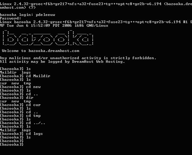 Hmm. I never tried ftp access until now and yeah, there's nothing useful there. Did you try logging into bazooka.dreamhost.com using the same credentials and the plain-old telnet command in Windows? Do Start / Run... / telnet.exe bazooka.dreamhost.com Then login using your credentials. Does that work?