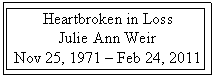 GSL Slip Renters and Marina Users. Most of you know Diana Wier and Cory from "Pack A Lunch" on 'K' dock. Diana's other daughter, Julie, was tragically killed in a car wreck on February 24th in Kearney, Nebraska. She was en route to SLC and Yosemite after graduating from the Federal Law Enforcement Training Center in Georgia. Julie was 39 years old. Below is the text from Diana's email: Hello again to all our and Julie's friends and family. We've added more names to this e-mail list in response to the outpouring of love. We would like to return that love to all of you, because we know you miss Julie also. We hope to respond to all of you individually at a later date, but this is what we can manage at this time. Julie's memorial service will be on Sunday the 13th, starting promptly at high noon, at Red Butte Garden, a beautiful botanical garden at the foothills of the Wasatch Mountains. All are invited to the ceremony that we are planning in conjunction with the Park Service. There will be an opportunity for you to speak at the service, to share any memories of Julie. After the service we are hosting a celebration in Julie's memory at Diana's house; a map will be included with the program at the service. An obituary will be in the Salt Lake Tribune on Sunday the 6th. Diana, Cory, Scott and John travelled to Nebraska earlier this week to conduct the awful business of last arrangements. Julie's essence was obvious even in death; we stroked her cheek and said a final goodbye to her physical remains. We were escorted by Swiss-Army-Knife Ranger John Madden in Kearney, Nebraska. He made us laugh even through our tears, and expressed the honor the entire Park Service held for Julie. We recovered precious items such as her flat hat, her FLETC diploma and letters of recognition, small keepsakes from the dashboard of her truck, and her collection of hair barrettes. Scott engraved a plaque on a brick that we nestled into the ground at the far edge of the freeway embankment; next to the brick we placed a spray of purple flowers. Text Box: Heartbroken in Loss Julie Ann Weir Nov 25, 1971 - Feb 24, 2011 This brick is 1.1 miles east of the Kearney Archway on I-80 eastbound, by the biggest fence post, beneath a large cottonwood tree with a distinctive broken limb on the west side. The one inspirational aspect of our trip to Kearney was the gathering of the sandhill cranes. These majestic birds stop along the Platte River, in numbers more than half a million strong, to re-fuel before continuing their migration. We like to believe the cranes' clarion call is beckoning Julie's spirit to join them on their northward journey. Diana, Cory, and Family JULIE WEIR | http://mi-cache.legacy.com/legacy/images/Cobrands/SaltLakeTribune/Photos/000 0670798-01-1_182830.jpgJulie Ann Weir 1971 ~ 2011 Julie Ann Weir died tragically in a motor vehicle collision near Kearney, Nebraska on February 24, 2011. Julie, a National Park Ranger, was en-route from Independence National Historical Park in Philadelphia to a new position at Klondike Gold Rush National Historical Park in Alaska, scheduled to start at the end of her field training in Yosemite National Park. Julie was born Thanksgiving Day, 1971, in Reno, Nevada. She began her Park Service career as a volunteer sled-dog trainer at Denali National Park in 1992. Since then she worked at 11 other national park sites across the country, from Maine to Texas to Alaska. Julie graduated from the Federal Law Enforcement Training Center (FLETC) on February 15, 2011 as a Federal Law Enforcement Ranger. Julie attended the University of Utah, was an emergency medical technician, with additional training in search and rescue, a wildland firefighter <http://www.legacy.com/legacies/firefighters/?personid=149104920&affiliateID =331> , and a brown belt in Tae Kwon Do. Julie is preceded in death by her father Gene A. Weir. She will be deeply missed by family members including mother Diana Weir-Goodell, sister Corinna Weir, brother-in-law Scott Olsen, Jerry and Daun Hartrim, Lesley and Vince Carlos, and the Troutwine, Weir, and Mossberg families. Julie has friends throughout the country and the National Park Service who join us in mourning her loss and honoring her memory. Julie lived passionately, and loved hiking and backpacking, canoeing, camping, skiing, traveling, beading, spinning, knitting, and quilting. We are comforted by our shared activities, preserved in hundreds of photographs, and will always treasure the gifts she made for us. A Memorial Service will be held on Sunday March 13th at Red Butte Garden, Salt Lake City. Seating will begin at 11:30 a.m, and the service will start promptly at noon. Parking is limited; car-pooling is suggested. A memorial fund has been established for Ranger Julie Weir at Red Butte Garden to plant a tree in remembrance. Donations to the Kearney, Nebraska, Volunteer Fire Department would also honor Julie's legacy. Published in Salt Lake Tribune on March 6, 2011 Dave Shearer Harbormaster Great Salt Lake State Marina 801-209-9142