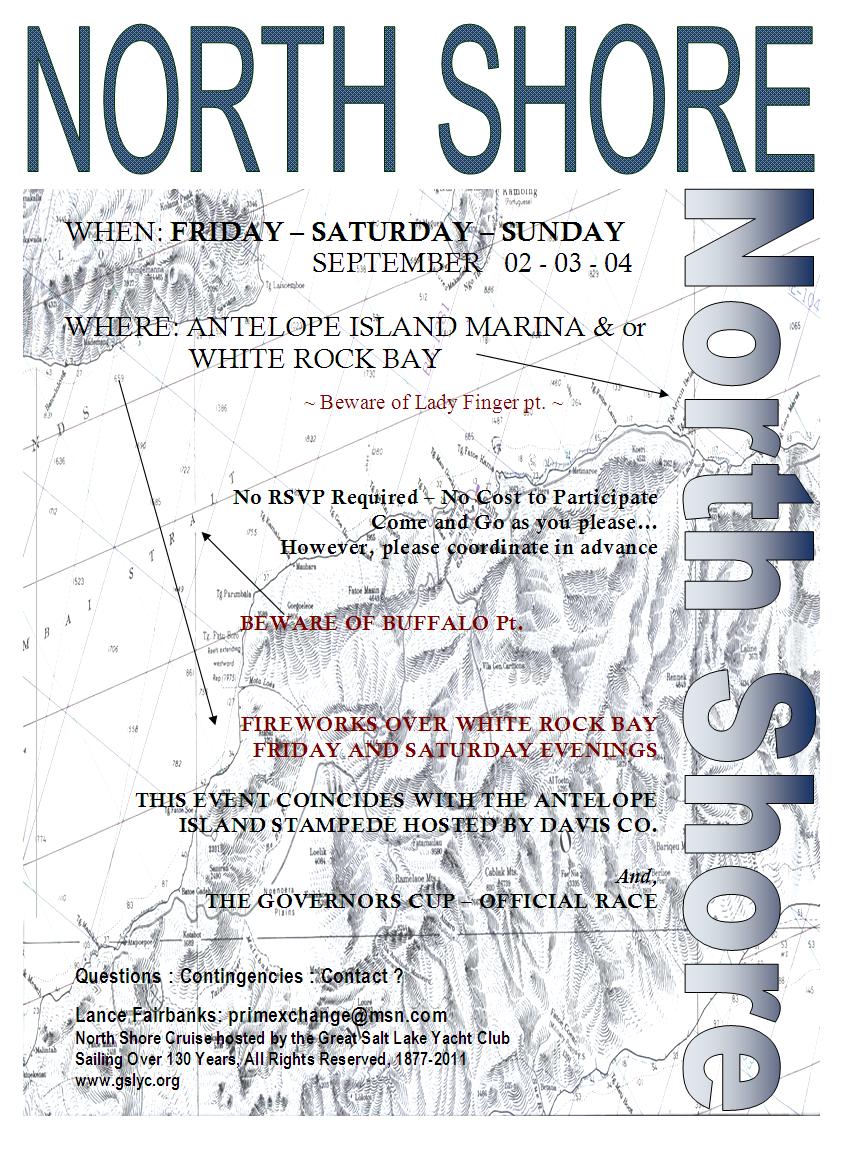 Dear Cruisers, Please find attached a Flyer for the North Shore Cruise, which coincides with the annual Antelope Island and Stampede and the Governor's Cup. This is a traditional event during Labor Day weekend. If anyone would like to coordinate Cruising Up-lake with another Sailboat, please contact me at your first convenience. I've got contacts; there is no contest, no cost and no commitment. And as always, Cruises are contingent upon the Weather. Please consult www.gslmarina.com