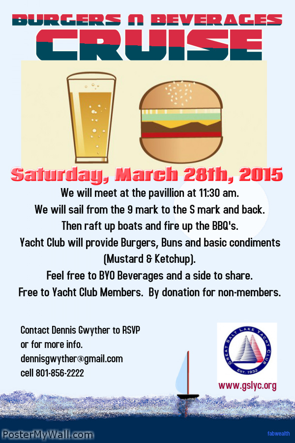 Let's all take advantage of this beautiful spring weather and the water we currently have! GSLYC BURGERS & BEVERAGES CRUISE Saturday March 28, 2015 11:30 AM - meet at the Yacht Club Pavillion Sail from 9 mark to S mark and back - then raft up and fire up the BBQ's The Yacht Club will provide burgers, buns and basic condiments (mustard and ketchup) Please feel free to bring a side dish, or other burger garnishments to share. Please bring your own beverages. Free to Yacht Club members - by donation for non-yacht club members. Please RSVP to Dennis Gwyther dennisgwyther@gmail.com<mailto:dennisgwyther@gmail.com> Cell 801-856-2222 Just a reminder to renew your Yacht Club Membership. The Yacht Club relies on those membership fees to pay for the socials and cruises throughout the year. Without those membership fees the socials and cruises can't happen. The Great Salt Lake Yacht Club is committed to helping us all get through what might be a very challenging summer with the current water levels and the dredging situation - but it needs your continued support and membership fees. I am not sure if everyone realizes how hard Dennis Gwyther worked with me at the Legislature to get the funding appropriation for the dredging. He was very valuable and instrumental in getting this accomplished. Please take the time to tell him "thank you" for his efforts. [http://www.toonpool.com/user/1446/files/spear_3460_sailing_195845.jpg] Janet Robins The Safety Consortium 400 W. Lawndale Dr. Salt Lake City, UT 84115 Phone: 801-746-2462 Fax: 801-803-6266