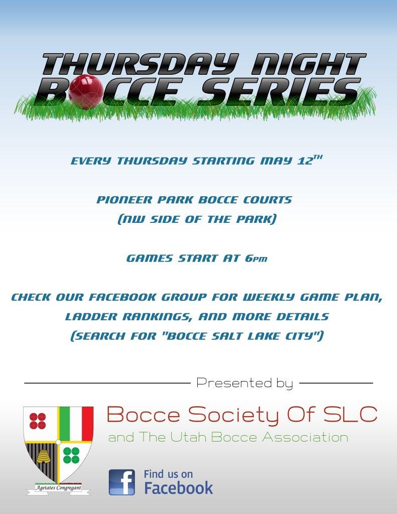 Hoping you could pass some information out to the fine italian folks about Bocce for the summer. Attached is the flyer for the Thursday night Bocce series starting Thursday, May 19th @ the Pioneer park Bocce courts. We will be playing every Thursday night at the park throughout the summer. We will have at least 2 courts in play. All are welcome to come and play. More info. find our Facebook page-Bocce Society of Salt Lake City. The page also contains tournament and league information throughout the year. Jim Webster and myself are also looking for any volunteers that might be intereted in helping teach the game of Bocce to the public and the annual Living Traditions Festival on May 20th-22nd. They can email me at peppingj@gmail.com or call me at (801) 865-4850 Thanks for your help. Sincerely, Johnny Peppinger