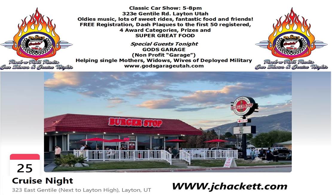 Classic Car Show: 5-8pm 323e Gentile Rd. Layton Utah Oldies music, lots of sweet rides, fantastic food and friends! FREE Registration, Dash Plaques to the first 50 registered, 4 Award Categories, Prizes and SUPER GREAT FOOD Special Guests Tonight GODS GARAGE (Non Profit "Garage") Helping single Mothers, Widows, Wives of Deployed Military www.godsgarageutah.com <http://www.godsgarageutah.com> Oh, Wait.. There is MORE !! Here's a little list of 2024 events we have scheduled.. Make a plan to join in.. Anytime you can, Check our Website for just a few more. <http://www.jchackett.com/> www.jchackett.com Sep 25, Wed5-8p LAYTON, Burger Stop Cruise Night, 323e Gentile Rd. 901-544-8090 Sep 27, Friday Mt. Carmel FREE Welcome Party Cruise Night Sep 28, Saturday Carmel Mountain Car Show 801-358-4656 Setting on the Beautiful Golf Course. Thunderbird Resort, Mt. Carmel Junction East Side of Zion National Park, Utah Oct 1, Tue 5-8p LEHI, One Man Band Cruise Night, 1220e Main, 801-766-0552 Oct 2, Wed 5-8p West Jordan, Jordan Landing Cruise Night, HALLOWEEN STYLE 3751w 70th s, Oct 5, Sat COPPERTON, Kulture Krash Kar Show, HALLOWEEN STYLE Copperton City Park, 801-360-8922 Oct 8, Tue 5-8p MURRAY, Shake Shack Cruise Night, HALLOWEEN STYLE 6123s State St. 801-448-7907 Oct 9, Wed PENDING West Valley City, HIRES Drive-in, HALLOWEEN STYLE 2900w 4700s 801-965-1010 OCTOBER 11 FRIDAY 11a-2p PENDING Beau's Saratoga CarQuest Auto Parts Customer Appreciation FREE Car Show 2148n Redwood Rd, Saratoga Springs Utah 385-287-0250 Oct 12, Sat open Oct 14, Mon All day Columbus Day Oct 15 Tuesday 5-8p LEHI ONE MAN BAND Get R Done 2024 Grand Finale Hosted by Timpanogos Rods & Customs Car Club FREE CRUISE NIGHT - HALLOWEEN STYLE (Open to Everyone, any and all makes, years, sizes) 801-766-0552 Oct 16, Wed West Valley City, Valley Fair Mall Cruise Night.. HALLOWEEN STYLE 3601s 2700w, East Side Oct 17, Thu South Jordan, Live Daybreak, SODA ROW Cruise Night, HALLOWEEN STYLE 11258s Kestral Rise Road, (11300s4700w) Oct 19 , Sat Reserved, Private Party Oct 22, Tue DRAPER, Garage Grill Cruise Night HALLOWEEN STYLE 1122e 12300s 801-523-3339 Oct 23, Wednesday 5-8p LayTon Burger Stop FREE CRUISE NIGHT HALLOWEEN STYLE 323e Gentile Rd Friday Oct 25th 5-8p St. George Digby's Market HALLOWEEN STYLE FREE CRUISE NIGHT 1955 Snow Canyon Parkway 435-310-5810 Saturday Oct 26th Washington Ut. 8a-3p 10th Annual FIRST RESPONDERS CARSHOW 300n 300e, Washington Elem. 435-623-2617 Oct 26th St. George 5-8p CULVERS Trunk N Treat FREE Cruise Night/Car Show Dixie Drive 435-623-2617 Darren Saturday Nov 9th Las Vegas Nev Art Goldstrom's 1st Memorial Car Show 5373 Cameron St. 702-876-3652 (SATURDAY AFTER THE SEMA SHOW) Saturday Nov 16 8a-3p Ivins VETERAN'S HOME VETERANS APPRECIATION CAR SHOW 160n 200e 435-632-2617 (Money RAISED here, STAYS here) $8-9000 in the previous 2 years Saturday Nov 30th St. George Utah 12-4p 14th Annual Toys for Tots FREE REGISTRATION Shane Dastrup 435-619-9770 Digby's Market Cash or Unwrapped gifts gladly accepted **** Please do NOT "hit reply" to this email, **** It goes to a mailing service If you would like to email us,, our address is <mailto:jc@jchackett.com> jc@jchackett.com If you know of anyone who would like to receive "Cruise Event Related" information, Simply have them shoot us an email.. They will be added to our mailing list, As you see, it is "blind copied" so others will not get your address.. Please feel free to pass this along to your friends. A Most Important rule to follow.. BE NICE, Think of others, Give someone, GIVE ANYONE a SMILE.. You would be so surprised how it will make YOU feel! CHECK OUR WEBSITE FOR MORE 2024 EVENTS J.C Hackett Oldies "Rock & Roll Radio" Productions Real Oldies, KCPX P.O Box 271226 Salt Lake City, Utah 84127 Website <http://www.jchackett.com> www.jchackett.com Email us at <mailto:jc@jchackett.com> jc@jchackett.com