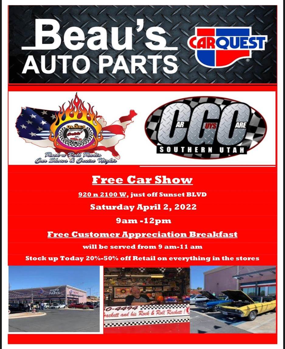 SATURDAY APRIL 2nd St. George Utah, USA Beautiful, Sunny, Warm, FREE-9am to High Noon Make plans to come join in on the Fun, and the Food ! Compliments of Beau Bradshaw's CARQUEST And Car Guys Care Southern Utah Hospitality, at its finest.. Its what Dixie is Known for !! FUTURE Up Coming Events 2 APR, SAT-- 9am to 12 Noon Beau's Carquest, St George Utah, USA 920n 2100w 435-522-3042 5 APR, TUE LEHI ONE MAN BAND Free Cruise Night 1220e Main Street Exit 279 801-766-0553 6 APR, WED 4-7pm JORDAN LANDING FREE CRUISE NIGHT 3751w 7273s s Plaza Center Drive By Famous Dave's 801-450-4494 9 APR, SAT St G Havoc Car Show at Washington City High School 435-632-2617 12 APR TUE (Pending - Call Hotline 801-450-4494) Herriman Garage Grill, FREE Cruise Night 4874w 12600s 5/8 14 APR, THU CANCELLED -- GODFATHERS SOLD 16 APR, SAT Timpanogos Harley Car-Truck-Bike Show, Lindon Ut. 17 APR, SUN Easter Sunday Monday, April 18 Tax Day 20 APR, WED Shake Shack FREE CRUISE NIGHT 6123s State 801-448-7907 21 APR, THU (Pending) Daybreak (Soda Row) FREE Cruise Night 23 APR, SAT 9-3 ROOSEVELT CARQUEST FREE CAR SHOW 25, US-40 435-722-5148 26 APR, TUE Draper Garage Grill, FREE CRUISE NIGHT 1122e 12300s Draper Parkway 801-523-3339 27 APR, WED LayTon, Burger Stop, FREE CRUISE NIGHT 323e Gentile Rd. Layton Ut. 28 APR, THU West Valley City, Valley Fair Mall, FREE CRUISE NIGHT 3601s 2700w 29 APR, FRI Moab Carquest FREE Cruise Night. 4-7p 1010s Main St. 435-259-2413 30 APR, SAT Moab Car Show - Swanny Park, John 435-260-1948 400n 100w Moab Utah, USA **** Please do NOT "hit reply" to this email, **** It goes to a mailing service If you would like to email us,, our address is <mailto:jc@jchackett.com> jc@jchackett.com If you know of anyone who would like to receive "Cruise Event Related" information, Simply have them shoot us an email.. They will be added to our mailing list, As you see, it is "blind copied" so others will not get your address.. Please feel free to pass this along to your friends. A Most Important rule to follow.. BE NICE, Think of others, Give someone, ANYONE a SMILE.. You would be so surprised how it will make YOU feel! J.C Hackett Oldies "Rock & Roll Radio" Productions Real Oldies, KCPX Salt Lake City, Utah 84127 www.jchackett.com <http://www.jchackett.com/> Email jc@jchackett.com <mailto:jc@jchackett.com>