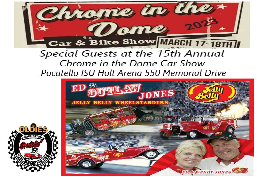 EXTRA -- EXTRA, Read all about it! Ed & Wendy Jones and their Exhibition Wheel Stander Fire Truck will be Featured Guests at the Chrome in the Dome Car Show Friday and Saturday March 17th & 18th, Holt Arena Dome, Pocatello Idaho, Fund Raiser for ISU Automotive Students. Pass the word along, Hope to see you THERE! MORE 2023 Scheduled Events.. 12 FEB, SUN 9 - 11am CRUISER BREAKFAST Golden Corral 665e 7200s 14 FEB, TUE Valentine's Day 18 FEB, SAT 9a-3p Las Vegas RED CAR SHOW.. 5375 Cameron St. 702-876-3652 20 FEB, MON Presidents' Day 12 MAR, SUN 9p-11am CRUISER BREAKFAST Golden Corral 665e 7200s 17 MAR, FRI 2p-9p Pocatello, Chrome in the Dome, Car Show ISU Holt arena, 550 Memorial Dr. (St. Patrick's Day) 18 MAR, SAT 9a-7p Pocatello, Chrome in the Dome, Car Show ISU Holt arena, 550 Memorial Dr. 25 MAR, SAT 9a-3p Washington, March Mayhem Car Show, Crimson Cliffs High School, 435-623-2617 4430s Crimson Cliffs Way 4 APR, TUE 5-8p LEHI ONE MAN BAND Free Cruise Night 1220e Main Street Exit 279 5 APR, WED 5-8p JORDAN LANDING FREE CRUISE NIGHT 3751w 7273s s Plaza Center Drive, By Famous Dave's 801-450-4494 9 APR, SUN Easter Sunday 14 APR, FRI 5-8p St. George Larson's FROSTOP FREE Cruise Night 858e St George Blvd. 435-623-2617 435-673-2216 15 APR, SAT 9a 3p St. George, HAVOC Car Show, Washington City Elem. School. 435-623-2617 420n 200w, Washington Utah 19 APR, WED 5-8p Murray, SHAKE SHACK Free Cruise Night, 6123s State ST, 801-448-7907 20 APR, THU 5-8 NO APRIL EVENT Live DayBreak (SoDa Row) FREE Cruise Night /Car Show, 22 APR, SAT 9a 3p Timpanogos Harley Car-Truck-Bike Show, Linden Ut 555s Geneva Rd. 25 APR, TUE GARAGE GRILL, Draper 1122e Draper Parkway (12300s) 26 APR, WED 5-8p Layton BURGERSTOP Free Cruise Night, 5/8 323e Gentile St 801-544-8090 27 APR, THU 5-8p West Valley City, Valley Fair Mall FREE Cruise Night, 3662s 2400w (East Side by Springhill Suites) 28 APR, FRI 4-7p MOAB Free CARQUEST Cruise Night, 1010s Main St. 435-259-2413 29 APR, SAT 9a 3p MOAB Car Show, Swanny Park, Moab Utah 100w 400n 435-260-1948 CHECK OUR WEBSITE FOR MORE 2023 EVENTS WWW.jchackett.com <http://WWW.jchackett.com> J.C Hackett Oldies "Rock & Roll Radio" Productions Real Oldies, KCPX Salt Lake City, Utah 84127 www.jchackett.com <http://www.jchackett.com/> Email jc@jchackett.com <mailto:jc@jchackett.com>