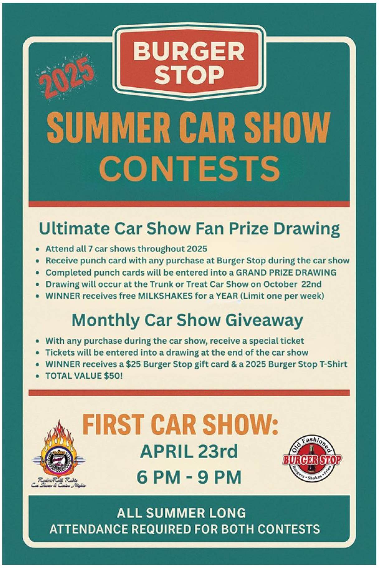 Burger Stop '25 Cruisin Contest Starts Wednesday April 23rd FREE CRUISE NIGHT 323e Gentile Road, Event runs from 5-8pm Awards - Dash Plaques-Door Prizes New. We are Grillin Burgers on the Patio too! (Please, no reserving spots 'till after lunch rush) <https://www.avast.com/sig-email?utm_medium=email&utm_source=link&utm_campai gn=sig-email&utm_content=emailclient> Virus-free. <https://www.avast.com/sig-email?utm_medium=email&utm_source=link&utm_campai gn=sig-email&utm_content=emailclient> www.avast.com -- This email has been checked for viruses by Avast antivirus software. www.avast.com