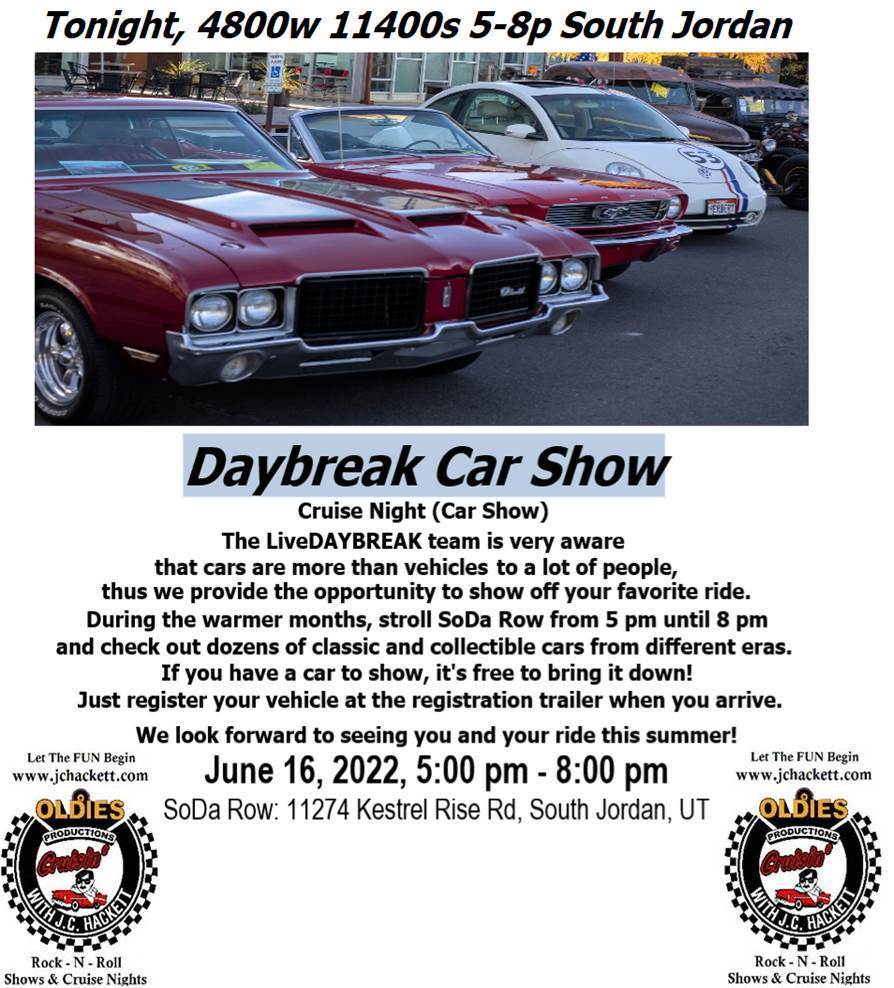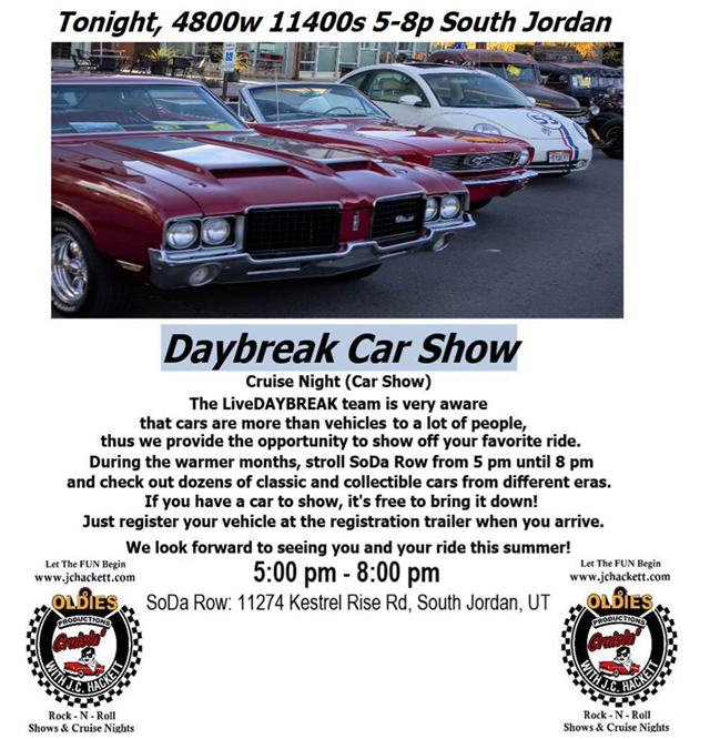 Drop By and Join us, Fun and FREE ***** Future Events 21 JUL, THU 5-8p Live Day Break SoDa Row FREE Cruise Night 11248 kestrel rise rd. 23 JUL, SAT Kamas Kar Show JUNKIE Car Show Kamas City Park, 26 JUL, TUE Garage Grill, Location Pending 27 JUL, WED Layton Burger Stop FREE Cruise Night, 323e Gentile Rd. Layton 28 JUL, THU Valley Fair Mall FREE CRUISE NIGHT, 3601s 2700w 5/8p 29 JUL, FRI Wells Fun Run, 30th Annual, Car-Truck-Motorcycle Show 775-752-1153 30 JUL, SAT Wells Fun Run, 30th Annual, Car-Truck-Motorcycle Show 775-752-1153 31 JUL, SUN Wells Fun Run, 30th Annual, Car-Truck-Motorcycle Show 775-752-1153 2 AUG, TUE LEHI ONE MAN BAND Free Cruise Night 1220e Main Street Exit 279 801-766-0553 3 AUG, WED JORDAN LANDING FREE CRUISE NIGHT 3751w 7273s s Plaza Center Drive By Famous Dave's 801-450-4494 5 AUG, FRI 5pm Evanston Welcome "Pot Luck" Party Hamblin Park Bowery 6 AUG, SAT Evanston 27th Annual Car Show, Hamblin Park, 203 Bear River Drive 9a-3p 8 AUG, MON Legends/Strap Tank FREE Cruise Night, 3661 Outlet Parkway Dr, Lehi 385-352-8194 **** Please do NOT "hit reply" to this email, **** It goes to a mailing service If you would like to email us,, our address is <mailto:jc@jchackett.com> jc@jchackett.com If you know of anyone who would like to receive "Cruise Event Related" information, Simply have them shoot us an email.. They will be added to our mailing list, As you see, it is "blind copied" so others will not get your address.. Please feel free to pass this along to your friends. A Most Important rule to follow.. BE NICE, Think of others, Give someone, ANYONE a SMILE.. You would be so surprised how it will make YOU feel! J.C Hackett Oldies "Rock & Roll Radio" Productions Real Oldies, KCPX Salt Lake City, Utah 84127 www.jchackett.com <http://www.jchackett.com/> Email jc@jchackett.com <mailto:jc@jchackett.com>