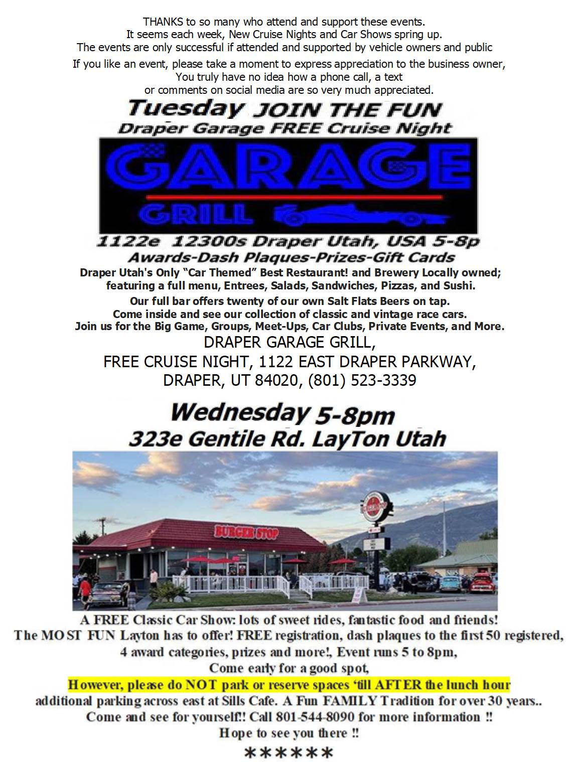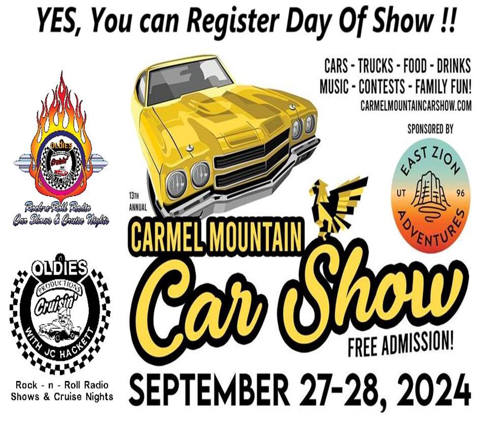GREETINGS EVERYONE ! Make plans to stop by a show (or two) before the weather changes! Here is a FANTASTIC weekend Getaway, and beautifully set ON THE THUNDERBIRD GOLF COURSE! On Old Highway 89, Just East of ZION National Park! Oh, Wait.. There is MORE !! Here's a little list of 2024 events we have scheduled.. Make a plan to join in.. Anytime you can, Check our Website for just a few more. <http://www.jchackett.com/> www.jchackett.com Sep 24, Tue 5-8p DRAPER, Garage Grill Cruise Night, 1122e 12300s 801-523-3339 Sep 25, Wed5-8p LAYTON, Burger Stop Cruise Night, 323e Gentile Rd. 901-544-8090 Sep 27, Friday Mt. Carmel FREE Welcome Party Cruise Night Sep 28, Saturday Carmel Mountain Car Show 801-358-4656 Setting on the Beautiful Golf Course. Thunderbird Resort, Mt. Carmel Junction East Side of Zion National Park, Utah Oct 1, Tue 5-8p LEHI, One Man Band Cruise Night, 1220e Main, 801-766-0552 Oct 2, Wed 5-8p West Jordan, Jordan Landing Cruise Night, 3751w 70th s, Oct 5, Sat COPPERTON, Kulture Krash Kar Show, HALLOWEEN STYLE Copperton City Park, 801-360-8922 Oct 8, Tue 5-8p MURRAY, Shake Shack Cruise Night, HALLOWEEN STYLE 6123s State St. 801-448-7907 Oct 9, Wed PENDING West Valley City, HIRES Drive-in, 2900w 4700s 801-965-1010 OCTOBER 11 FRIDAY 11a-2p PENDING Beau's Saratoga CarQuest Auto Parts Customer Appreciation FREE Car Show 2148n Redwood Rd, Saratoga Springs Utah 385-287-0250 Oct 12, Sat open Oct 14, Mon All day Columbus Day Oct 15 Tuesday 5-8p LEHI ONE MAN BAND Get R Done 2024 Grand Finale Hosted by Timpanogos Rods & Customs Car Club FREE CRUISE NIGHT (Open to Everyone, any and all makes, years, sizes) 801-766-0552 Oct 16, Wed West Valley City, Valley Fair Mall Cruise Night.. HALLOWEEN STYLE 3601s 2700w, East Side Oct 17, Thu South Jordan, Live Daybreak, SODA ROW Cruise Night, HALLOWEEN STYLE 11258s Kestral Rise Road, (11300s4700w) Oct 19 , Sat Reserved, Private Party Oct 22, Tue DRAPER, Garage Grill Cruise Night HALLOWEEN STYLE 1122e 12300s 801-523-3339 Oct 23, Wednesday 5-8p LayTon Burger Stop FREE CRUISE NIGHT HALLOWEEN STYLE 323e Gentile Rd Friday Oct 25th 5-8p St. George Digby's Market HALLOWEEN STYLE FREE CRUISE NIGHT 1955 Snow Canyon Parkway 435-310-5810 Saturday Oct 26th Washington Ut. 8a-3p 10th Annual FIRST RESPONDERS CARSHOW 300n 300e, Washington Elem. 435-623-2617 Oct 26th St. George 5-8p CULVERS Trunk N Treat FREE Cruise Night/Car Show Dixie Drive 435-623-2617 Darren Saturday Nov 9th Las Vegas Nev Art Goldstrom's 1st Memorial Car Show 5373 Cameron St. 702-876-3652 (SATURDAY AFTER THE SEMA SHOW) Saturday Nov 16 8a-3p Ivins VETERAN'S HOME VETERANS APPRECIATION CAR SHOW 160n 200e 435-632-2617 (Money RAISED here, STAYS here) $8-9000 in the previous 2 years Saturday Nov 30th St. George Utah 12-4p 14th Annual Toys for Tots FREE REGISTRATION Shane Dastrup 435-619-9770 Digby's Market Cash or Unwrapped gifts gladly accepted **** Please do NOT "hit reply" to this email, **** It goes to a mailing service If you would like to email us,, our address is <mailto:jc@jchackett.com> jc@jchackett.com If you know of anyone who would like to receive "Cruise Event Related" information, Simply have them shoot us an email.. They will be added to our mailing list, As you see, it is "blind copied" so others will not get your address.. Please feel free to pass this along to your friends. A Most Important rule to follow.. BE NICE, Think of others, Give someone, GIVE ANYONE a SMILE.. You would be so surprised how it will make YOU feel! CHECK OUR WEBSITE FOR MORE 2024 EVENTS J.C Hackett Oldies "Rock & Roll Radio" Productions Real Oldies, KCPX P.O Box 271226 Salt Lake City, Utah 84127 Website <http://www.jchackett.com> www.jchackett.com Email us at <mailto:jc@jchackett.com> jc@jchackett.com