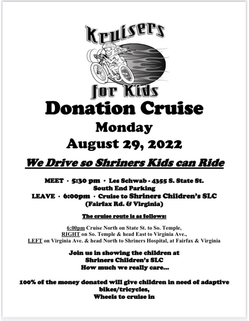 Happening TONIGHT,, Starting at Les Schwab 4355s State, Gather from 5 to 6, leave at 6 SHARP. Cruise to the Shriners Hospital.. Absolutely open to EVERYONE, All Makes, Sizes, Colors.. Some folks bring goodies for the kids at Shriners. I suggest you bring a tissue,, When our FAMILY OF FRIENDS give the folks at Shriners a check for funds raised,, It's the best feeling in the world. !! We have all contributed to this in many ways, some financially, some just by attending .. It takes us ALL to do something like this.. BE THERE TONIGHT.. Its the best "Feel good" moment you will experience..