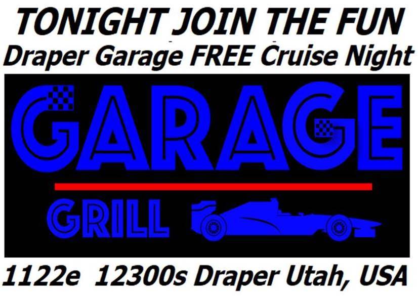 TONIGHT, Is Taco Tuesday at the Garage Grill in Draper We absolutely pack the house at the Garage Grill locations,.. Always Dash Plaques to the first 75 to register, All Awards chosen/selected by Garage Grill Employees, Gift Cards and Garage "Swag" as door prizes, Managers Choice, Sponsors Choice, Wasatch Customs, Specialty Awards and Jax Wax.. And tonight, HALLOWEEN STYLE AWARDS.. Bring Candy for the little kiddies, and the not so little kiddies!! Join us for a FREE Classic Car Cruise Night. Draper Utah's Only "Car Themed" Best Restaurant! and Brewery Locally owned; featuring a full menu, Entrees, Salads, Sandwiches, Pizzas, and Sushi. The Garage Grill full bar offers twenty of our own Salt Flats Beers on tap. Come inside and see our collection of classic and vintage race cars. Join us for the Big Game, Groups, Meet-Ups, Car Clubs, Private Events, and More. DRAPER GARAGE GRILL, FREE CRUISE NIGHT, 1122 EAST DRAPER PARKWAY, DRAPER, UT 84020, (801) 523-3339 This event is brought to you in partnership with JC Hackett Shows. Get out of your Zip Code!, Have some fun before More of the White Stuff flies! MORE Future Events 25 OCT, TUE DRAPER Garage Grill, Halloween Cruise Night 1122e 12300s 5/8p 801-523--3339 26 OCT, WED Burger Stop HALLOWEEN Car Show FREE, 323e Gentile Rd. Layton ?? 27 OCT, THU Valley Fair Mall HALLOWEEN Car Show 3601s 2700w W.V.C.. Ut. 29 OCT Saturday 1st Responders Appreciation Car Show (Halloween Style) St. George Ut. 300n 300e Ivins Ut. Washington Elementary 10-3p 435-632-2617 Darren 29 October 5-8pm HALLOWEEN Free Cruise Night, Texas Roadhouse 2654 Red Cliffs Dr. St. George Ut. 435-619-9770 Shane 5 November 9a-4p Goldstrom's Car Show Nostalgia Street Rods Free Museum Tours Day Of show Free to the Public Registration fee donated to Charity 5375 Cameron St. Las Vegas Nev 702-876-3652 12 NOVEMBER 10a-3p Tribute to our VETERANS Car Show 160n 200e Ivins Ut 435-632-2617 Darren *Special Guest Speakers, Jack Pettit* And Dick Nourse 3 DECEMBER 12-4 Toys 4 Tots Fund Raiser Beau's CARQUEST, St George Ut. 920n 2100w Shane 435-619-9770 or 435-673-3577 11 FEBRUARY 2023 Las Vegas Nevada THE RED CAR SHOW Goldstrom's Nostalgia Museum Free Museum Tours Day Of show Free to the Public Registration fee donated to Charity 5375 Cameron St. Las Vegas Nev 702-876-3652 17-18 March 2023 POCATELLO CHROME IN THE DOME Scholarship Fund Raiser Car Show 550 Memorial Drive Inside the Dome, Holt Arena **** Please do NOT "hit reply" to this email, **** It goes to a mailing service If you would like to email us,, our address is <mailto:jc@jchackett.com> jc@jchackett.com If you know of anyone who would like to receive "Cruise Event Related" information, Simply have them shoot us an email.. They will be added to our mailing list, As you see, it is "blind copied" so others will not get your address.. Please feel free to pass this along to your friends. A Most Important rule to follow.. BE NICE, Think of others, Give someone, ANYONE a SMILE.. You would be so surprised how it will make YOU feel! J.C Hackett Oldies "Rock & Roll Radio" Productions Real Oldies, KCPX Salt Lake City, Utah 84127 www.jchackett.com <http://www.jchackett.com/> Email jc@jchackett.com <mailto:jc@jchackett.com>