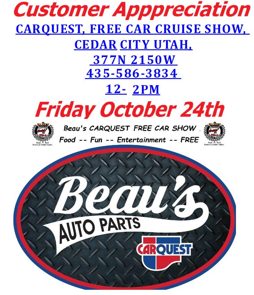 Make plans to drop on by Friday Oct 24th, just 2 blocks west of the freeway exit. Another one of their Customer Appreciation blow-out parties!! Everything is all set., The BBQ Grills, The Burgers, The Hot Dogs And,, In store super sales !! Awards-Dash Plaques-Prizes FREE-free--FREE We sincerely hope you and your family have a great time. Now the kids we used to bring with us, are bringing their own kids. What a fantastic "family" Tradition! Oh, Wait, There more,. ok, a little More than a little.. Here's a little list of 2025 events we have scheduled.. Make a plan to join in.. Anytime you can, Check our Website <http://www.jchackett.com> www.jchackett.com 24 Oct, Fri, Noon to 2pm CEDAR CITY CARQUEST CUSTOMER APPRECIATION CRUISE NIGHT 377n 2150w 435-586-3834 25 Oct, Sat 10a - 3p Washington, 1st Responders Car Show, New Location in Washington Ut. 435-632-2617 27 Oct, Mon 5-7p St. George Car-Truck-Bike Show at The Cottages, Darren 435-623-2617 28 October, HALLOWEEN PARTY DRAPER GARAGE GRILL 12300s 1300e 30 October St. George Utah HALLOWEEN CRUISE NIGHT At DIGBY's Market 5pm to 7:30 1955 Snow Canyon Drive 435-623-2617 Darren 31 Oct, Fri 2 Nov, Sun Daylight Saving Time ends 4 Nov, Tue Election Day 8 Nov, Sat Las Vegas, Art Goldstrom's Memorial Car-Truck-Bike show, 5375 Cameron St 702-876-3652 11 Nov, Tue Veterans Day 15 Nov, Sat Ivins Veteran Appreciation Car-Truck-Bike Show , The money WE raise here.. STAYS HERE! 160n 200e 435-623-2617 Darren 27 Nov, Thu Thanksgiving Day 6 Dec, Sat St. George, Toys for Tots, Car-Truck-Bike Show, Digby's Market, 1155 Snow Canyon Parkway, 435-623-2617 Darren 21 February 2026 Red Car Show, Nostalgia Street Rods Las Vegas Nevada, 702-503-5389 Randall March 6-7 2026 Friday & Saturday ONLY Pocatello Chrome in the Dome **** Please do NOT "hit reply" to this email, **** It goes to a mailing service If you would like to email us,, our address is <mailto:jc@jchackett.com> jc@jchackett.com If you know of anyone who would like to receive "Cruise Event Related" information, Simply have them shoot us an email.. They will be added to our mailing list, As you see, it is "blind copied" so others will not get your address.. Please feel free to pass this along to your friends. A Most Important rule to follow.. BE NICE, Think of others, Give someone, GIVE EVERYONE a SMILE.. You would be so surprised how it will make YOU feel! CHECK OUR WEBSITE FOR MORE 2025 EVENTS .C Hackett Oldies "Rock & Roll Radio" Productions Real Oldies, KCPX P.O Box 271226 Salt Lake City, Utah 84127 <http://www.jchackett.com> www.jchackett.com Email us at <mailto:jc@jchackett.com> jc@jchackett.com