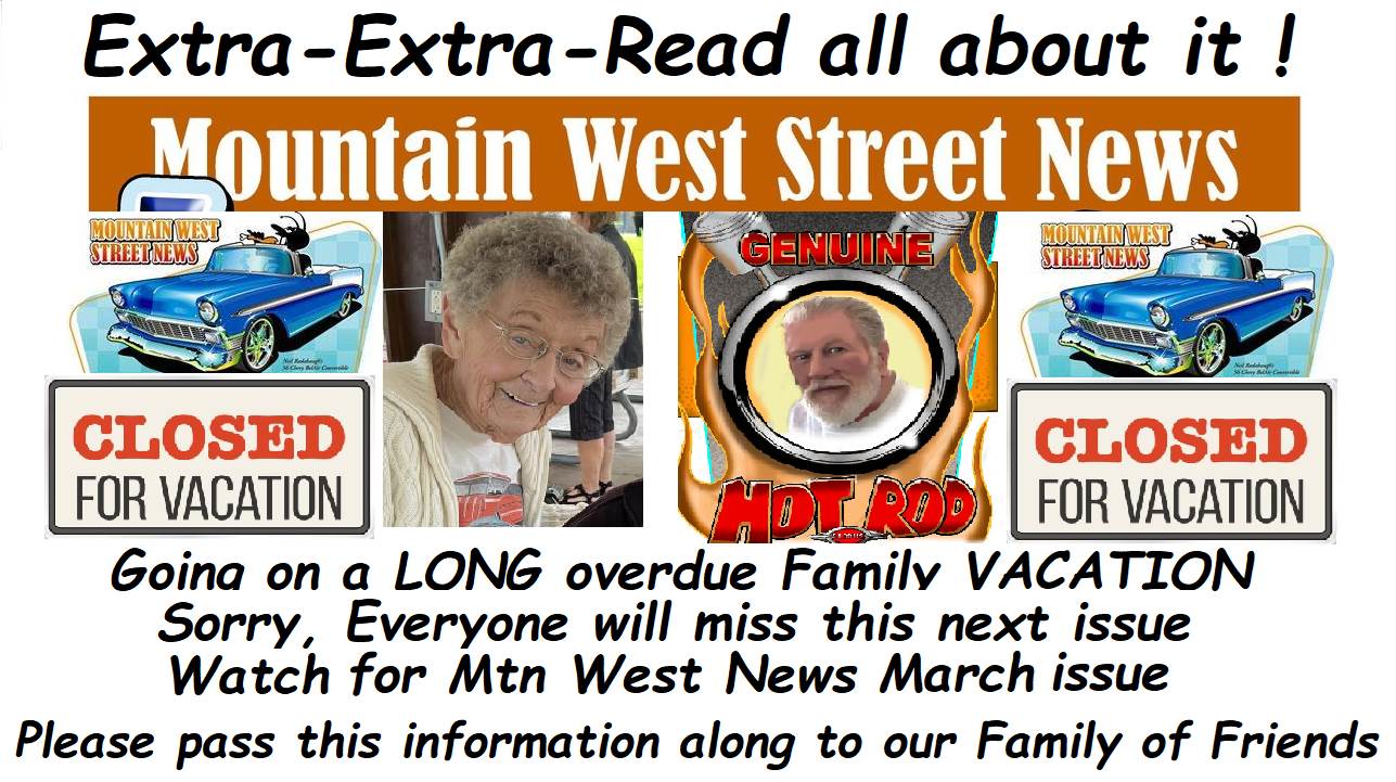 Greetings.. In all my years affiliated with Mountain West Street News And being FRIENDS (Family) with Bob & Weezie I can NEVER remember them taking a vacation of any kind So, this is long overdue and well deserved! You won't see the next issue of Mountain West Street News But, you cant stop the March issue (Unless the boat sinks) This Bi-Monthly Automotive Magazine is The ONLY Utah based Hot Rod Print Magazine left. As its said . The last of the Great Ones! Bon Voyage Eames Family! Have a Great Time Take LOTS of Pictures! J.C **** Please do NOT "hit reply" to this email, **** (It goes to a mailing service) If you would like to email us,, our address is <mailto:jc@jchackett.com> jc@jchackett.com If you know of anyone who would like to receive "Cruise Event Related" information, Simply have them shoot us an email.. They will be added to our mailing list, As you see, this is "blind copied" so others will not get your address.. Please feel free to pass this along to your friends. A Most Important rule to follow.. BE NICE, Think of others, Give EVERYONE a SMILE.. You would be so surprised how it will make YOU feel! J.C Hackett Oldies "Rock & Roll Radio" P.O Box 271226 Salt Lake City, Utah 84127 <http://www.jchackett.com> www.jchackett.com 801-450-4494