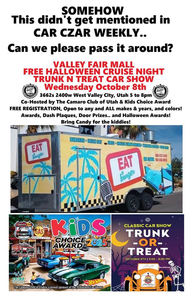 Oh, Wait, There more,. ok, a little More than a little.. Here's a little list of 2025 events we have scheduled.. Make a plan to join in.. Anytime you can, Check our Website <http://www.jchackett.com> www.jchackett.com 7 Oct, Tue LEHI, One Man Band FREE Cruise Night 801-766-0553 8 October, Wednesday 5-8p VALLEY FAIR MALL Free HALLOWEEN STYLE CRUISE NIGHT 3600s 2700w East Side 10 October Friday BEAVER CARQUEST Free Customer Appreciation Car Show 85n Main Street, Beaver Utah 435-438-2347 Saturday, October 11 8 -3pm **SPOOKTACULAR** The Original ROCKTOBER Car Show, Kermit's show Enter to win a 1967 THUNDERBIRD 98e 400n, Richfield City Park, 435-201-9754 13 Oct, Mon Columbus Day 14 Oct, Tue Murray, Shake Shack FREE Cruise Night, Halloween Style Trunk N Treat 6123s State 801-448-7907 16 Oct, Thu South Jordan Daybreak/Soda Row FREE Cruise Night Halloween Style Trunk N Treat 11248s 4700w 801-204-2775 18 October Sat C-10 Halloween Party FREE Car/TRUCK Show 801-833-3439 22 Oct, Wed LayTon BurgerStop FREE Cruise Night, Halloween Style Trunk N Treat 323e Gentile Rd 801-544-8090 24 Oct, Fri CEDAR CITY CARQUEST Customer Appreciation FREE Car Show 377n 2150w 435-586-3834 25 Oct, Sat Washington, 1st Responders Car Show, New Location in Washington Ut. 435-632-2617 27 Oct, Mon St. George Car-Truck-Bike Show at The Cottages, Darren 435-623-2617 28 October, PENDING !! HALLOWEEN PARTY DRAPER GARAGE GRILL 12300s 1300e 31 Oct, Fri Halloween 2 Nov, Sun Daylight Saving Time ends 4 Nov, Tue Election Day 8 Nov, Sat Las Vegas, Art Goldstrom's Memorial Car-Truck-Bike show, 5375 Cameron St 702-876-3652 11 Nov, Tue Veterans Day 15 Nov, Sat Ivins Veteran Appreciation Car-Truck-Bike Show , 160n 200e 435-623-2617 Darren 27 Nov, Thu Thanksgiving Day 6 Dec, Sat St. George, Toys for Tots, Car-Truck-Bike Show, Digby's Market, 1155 Snow Canyon Parkway, 435-623-2617 Darren 21 February 2026 Red Car Show, Nostalgia Street Rods Las Vegas Nevada, 702-503-5389 Randall March 6-7 2026 Friday & Saturday ONLY Pocatello Chrome in the Dome **** Please do NOT "hit reply" to this email, **** It goes to a mailing service If you would like to email us,, our address is <mailto:jc@jchackett.com> jc@jchackett.com If you know of anyone who would like to receive "Cruise Event Related" information, Simply have them shoot us an email.. They will be added to our mailing list, As you see, it is "blind copied" so others will not get your address.. Please feel free to pass this along to your friends. A Most Important rule to follow.. BE NICE, Think of others, Give someone, GIVE ANYONE a SMILE.. You would be so surprised how it will make YOU feel! CHECK OUR WEBSITE FOR MORE 2025 EVENTS