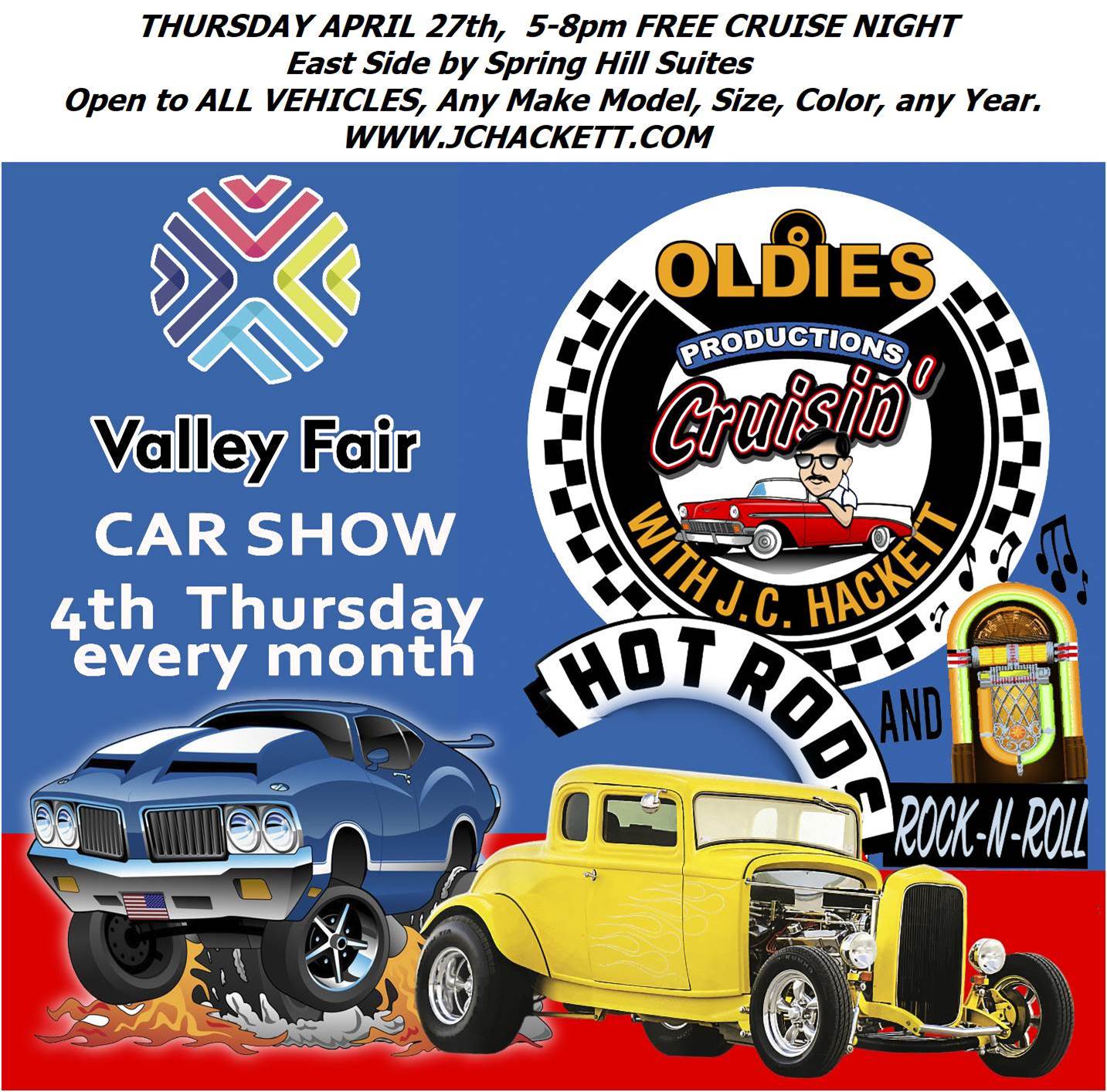 See our website for more events.. www.jchackett.com <http://www.jchackett.com> ***** Future Events 27 APR, THU 5-8p West Valley City, Valley Fair Mall FREE Cruise Night, 3662s 2400w (East Side by Springhill Suites) 28 APR, FRI 4-7p MOAB Free CARQUEST Cruise Night, 1010s Main St. 435-259-2413 29 APR, SAT 9a 3p MOAB Car Show, Swanny Park, Moab Utah 100w 400n 435-260-1948 2 MAY 5-7 LEHI One Man Band FREE Cruise Night 1220e Main St 801-766-0552 3 MAY 5-7p West Jordan Jordan Landing FREE Cruise Night 3751w 70th South 5 MAY 3-7p PAGE ARIZONA Welcome/Registration Cruise Night PARTY 665s Lake Powell Blvd. 928-691-0042 5 MAY 8-3p PAGE ARIZONA CAR SHOW Page City Park 600n Navajo St 928-691-0042 10 MAY 5-7P WEST VALLEY CITY HIRES FREE CRUISE NIGHT 2900W 4700S 801-965-1010 13 MAY 8-3P Heber City CARQUEST FREE CAR SHOW 434n Main St 435-654-1520 **** Please do NOT "hit reply" to this email, **** It goes to a mailing service If you would like to email us,, our address is <mailto:jc@jchackett.com> jc@jchackett.com If you know of anyone who would like to receive "Cruise Event Related" information, Simply have them shoot us an email.. They will be added to our mailing list, As you see, it is "blind copied" so others will not get your address.. Please feel free to pass this along to your friends. A Most Important rule to follow.. BE NICE, Think of others, Give someone, ANYONE a SMILE.. You would be so surprised how it will make YOU feel! J.C Hackett Oldies "Rock & Roll Radio" Productions Real Oldies, KCPX Salt Lake City, Utah 84127 www.jchackett.com <http://www.jchackett.com/> Email jc@jchackett.com <mailto:jc@jchackett.com>