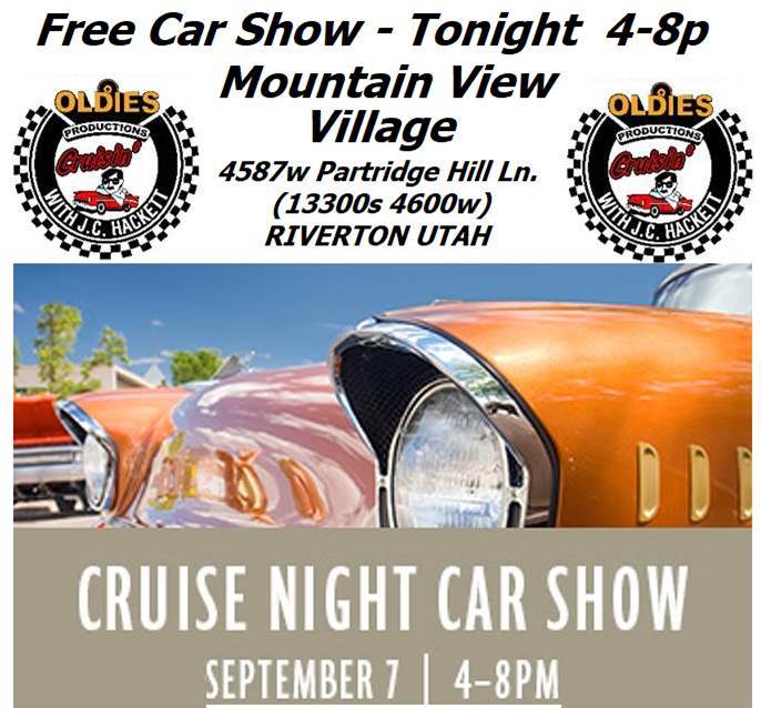 TONIGHT Mountain View Village, FREE Car Show/Cruise Night, 4587 Partridge Hill Lane West Riverton, Utah 84096, by MOD PIZZA!! Several top-quality restaurants to select from. . Awards, Dash Plaques and door prizes, And a unique beautiful shopping center to experience. The project consists of retail, restaurant, office, gym, hotel and a full luxury theater, Currently 37 premier shops, stores, restaurants are available, with more sites planned. Be sure to check their website.. <https://www.mountainviewvillage.com/> https://www.mountainviewvillage.com Come and see what you are missing.. They are just getting started! The folks at Mountain View Village (Shopping Center) Invite us all out TONIGHT to a New Cruise Night for 2023. See you somewhere.. HOPEFULLY REAL SOON, Like TODAY! !! FUTURE J.C Hackett Hosted EVENTS 7 SEP, THU 4-8P Mountain View Village, FREE Car Show 4578w Partridge Hill Lane\Riverton Utah (13300s 4600w) 9 SEP, SAT 5-8P BRIGHAM City PEACH DAYS FREE Car Show, 800w Forest Street, 435-723-3981 Saturday, September 9 PEACH DAYS.. Brigham City. monica@boxelderchamber.com <mailto:monica@boxelderchamber.com> 435-723-3931 13 SEP, WED HIRES- WVC FREE CRUISE NIGHT, 2900w 4700s Free CRUISE NIGHT, 5/8p 20 SEP, WED 5-8P Murray, SHAKE SHACK Free Cruise Night, 6123s State ST, 801-448-7907 21 SEP, THU5-8P Live DayBreak (SoDa Row) FREE Cruise Night /Car Show, 11248 Kestrel Rise Rd. (11300s-4700w) 22 SEP, FRI 5-7P FREE Cruise Night Party at Thunderbird Lodge Mt. Carmel Junction, Utah 23 SEP, SAT 8A-4P Mt Carmel THUNDERBIRD Lodge Car Show 26 SEP, TUE 5-8P Draper Garage Grill 1122e 12300s 801-523-3339 27 SEP, WED Layton BURGERSTOP Free Cruise Night, 5/8 323e Gentile St 801-544-8090 28 SEP, THU 5-8P West Valley City, Valley Fair Mall FREE Cruise Night, East Side by Springhill Suites.. 30 SEP, SAT St. George (Washington) Falcon Storage Grand Opening CAR SHOW, 24e Industrial Drive, Washington Utah On site food by EAT A BURGER!! 435-632-2617 3 OCT, TUE 5-8P LEHI ONE MAN BAND Free Cruise Night 1220e Main Street Exit 279 4 OCT, WED 5-8P JORDAN LANDING FREE CRUISE NIGHT 3751w 7273s s Plaza Center Drive) By Famous Dave's 801-450-4494 7 OCT, SAT 8A-4P COPPERTON Kulture Krash Kar-Truck-Bike Show, Halloween Style 801-360-8922 8090w 10305s Copperton City Park. 11 OCT, WED 5-8p FREE CRUISE NIGHT Hires Drive-in, West Valley City, Utah Halloween Style 2900w 4700s Free CRUISE NIGHT, 5/8p 14 OCT, SAT St. George (Washington) to Mesquite Car-Bike Cruise Fundraiser for officer Brad Coleman.. 435-632-2617 17 OCT, TUE Lehi GET ER DONE FINALE Lehi One Man Band 1220e Main St. 18 OCT, WED HALLOWEEN STYLE Murray, SHAKE SHACK Free Cruise Night, 6123s State ST, 801-448-7907 19 OCT, THU HALLOWEEN STYLE Live DayBreak (SoDa Row) FREE Cruise Night /Car Show, 11248 Kestrel Rise Rd. (11300s-4700w) 24 OCT, TUE HALLOWEEN STYLE Garage Grill Draper.. FREE Cruise Night 1122e 12300s, Draper Utah 801-523-3339 25 OCT, WED HALLOWEEN STYLE Layton BURGERSTOP Free Cruise Night, 5/8 323e Gentile St 801-544-8090 26 OCT, THU Halloween Style West Valley City, Valley Fair Mall FREE Cruise Night, East Side by Springhill Suites.. 28 OCT, SAT Washington City, First Responders CAR SHOW, Washington Elem. School. 300n 300s 435-623-2617 31 OCT, TUE Tuesday, October 31 Halloweens 4 NOVEMBER, SAT LAS VEGAS NEVADA 8-4p (Entry fee includes T-shirt) Goldstrom's Nostalgia Museum Annual Car-Truck-Bike Show 5375 Cameon St, Las Vegas Nevada USA 702-876-3652 Please check our website for More of our fun, And event information www.jchackett.com/events <http://www.jchackett.com/events> If you would like to email us,, our address is jc@jchackett.com <mailto:jc@jchackett.com> If you know of anyone who would like to receive "Cruise Event Related" information, Simply have them shoot us an email.. They will be added to our mailing list, As you see, it is "blind copied" so others will not get your address.. Please feel free to pass this along to your friends. A Most Important rule to follow.. Be Nice, Think of others, Give someone, Give Everyone a SMILE.. You would be so surprised how it will make YOU feel! **** Please do NOT "hit reply" to this email, **** It goes to a mailing service To reply to us.. Email us at jc@jchackett.com <mailto:jc@jchackett.com> Or Hackett56@comcast.net <mailto:Hackett56@comcast.net> Or.. Call our Event Hotline 801-450-4494