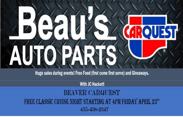 SHUTTING DOWN MAIN STREET Beaver Utah for a Car Show!! Today - Friday April 23 FREE EVENT - Come join us !! Yes, indeed Beaver City Carquest is having a FREE Classic Car Cruise Night! Open to any and all Hot Rods, Classics, Rat Rods, Trucks and Motorcycles. Awards, Prizes and Dash plaques. Special Awards by the Mayor, Police, Fire Dept. Search & Rescue, County Commissioners, County Sheriff, Beaver Highway Patrol, and More! (I LOVE BEAVER !) FREE Registration, Door prizes, Awards and Dash Plaques Event runs 5 to Dusk. Call for more info, 435-438-2347.. Everything you expect from Carquest. and, of course.. A LOT MORE! We pride ourselves on being the BEST in the Automotive Business. Beau's Beaver City Carquest! ---- FUTURE EVENTS ---- 22 APR, THU WEST VALLEY CITY, VALLEY FAIR MALL Free Cruise Night 5/8 3600s 2700w 801-969-6211 ex 10 23 APRIL, Fri, 4-7p Beaver City CarQuest Free Cruise Night 85n Main St, 435-438-2347 24 APR, SAT Las VEGAS, Goldstroms RED CAR SHOW, 5375 Cameron St. 702-876-3652 (New Official Date) 27 APR, TUE 5/8p DRAPER The GARAGE GRILL FREE CRUISE NIGHT 1122e 12300s 28 APR, WED 5/8p NO LAYTON BURGERSTOP Free Cruise Night, See you in May 30 APR, FRI Page Ariz FREE Cruise Night Cool Cruise around the city, and over the old dam. 1 MAY, SAT Page Ariz, Warren Whistler Memorial Car Show, Page City Park. 4 MAY, TUE 5/8p LEHI ONE MAN BAND Free Cruise Night 1220e Main Street Exit 279 801-766-0553 5 MAY, WED 5/8p JORDAN LANDING FREE CRUISE NIGHT 3751w 7273s s Plaza Center Drive, By Famous Dave's 801-450-4494 Wednesday, May 5 All day Cinco de Mayo 8 MAY, SAT 9-3p Heber City CarQuest Celebration Sale and FREE Car Show Jason Peterson, 435-654-1520 9 MAY, SUN Mother's Day Please check our website for More of our fun, And event information www.jchackett.com/events Please remember "social distancing" and health department suggestions, We have a lot of our Cruiser Family of Friends who are at Risk and are limiting themselves to any exposure.. Keep them in your thoughts,, Call or communicate with them as frequent as possible,, You have no idea how a simple gesture, can mean so much. cid:image003.jpg@01D5F14E.62E7D000 **** Please do NOT "hit reply" to this email, **** It goes to a mailing service If you would like to email us,, our address is jc@jchackett.com If you know of anyone who would like to receive "Cruise Event Related" information, Simply have them shoot us an email.. They will be added to our mailing list, As you see, it is "blind copied" so others will not get your address.. Please feel free to pass this along to your friends. A Most Important rule to follow.. BE NICE, Think of others, Give someone, ANYONE a SMILE.. You would be so surprised how it will make YOU feel! J.C Hackett Oldies "Rock & Roll Radio" Productions Real Oldies, KCPX P.O Box 271226 Salt Lake City, Utah 84127 www.jchackett.com Email us at jc@jchackett.com -- This email has been checked for viruses by Avast antivirus software. https://www.avast.com/antivirus
