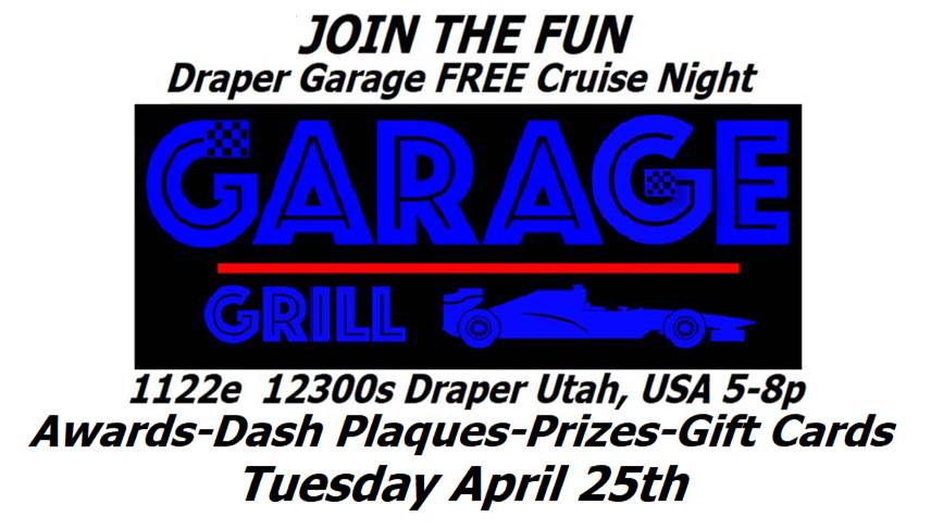 Join us the 4th Tuesday, April thru October for a FREE Classic Car Cruise Night. Draper Utah's Only "Car Themed" Best Restaurant! and Brewery Locally owned; featuring a full menu, Entrees, Salads, Sandwiches, Pizzas, and Sushi. Our full bar offers twenty of our own Salt Flats Beers on tap. Come inside and see our collection of classic and vintage race cars. Join us for the Big Game, Groups, Meet-Ups, Car Clubs, Private Events, and More. DRAPER GARAGE GRILL, FREE CRUISE NIGHT, 1122 EAST DRAPER PARKWAY, DRAPER, UT 84020, (801) 523-3339 See our website for more events.. www.jchackett.com <http://www.jchackett.com> ***** Future Events 25 APR, TUE 5-8p GARAGE GRILL, Draper 1122e Draper Parkway (12300s) 26 APR, WED 5-8p Layton BURGERSTOP Free Cruise Night, 5/8 323e Gentile St 801-544-8090 27 APR, THU 5-8p West Valley City, Valley Fair Mall FREE Cruise Night, 3662s 2400w (East Side by Springhill Suites) 28 APR, FRI 4-7p MOAB Free CARQUEST Cruise Night, 1010s Main St. 435-259-2413 29 APR, SAT 9a 3p MOAB Car Show, Swanny Park, Moab Utah 100w 400n 435-260-1948 2 MAY 5-7 LEHI One Man Band FREE Cruise Night 1220e Main St 801-766-0552 3 MAY 5-7p West Jordan Jordan Landing FREE Cruise Night 3751w 70th South 5 MAY 3-7p PAGE ARIZONA Welcome/Registration Cruise Night PARTY 665s Lake Powell Blvd. 928-691-0042 5 MAY 8-3p PAGE ARIZONA CAR SHOW Page City Park 600n Navajo St 928-691-0042 10 MAY 5-7P WEST VALLEY CITY HIRES FREE CRUISE NIGHT 2900W 4700S 801-965-1010 13 MAY 8-3P Heber City CARQUEST FREE CAR SHOW 434n Main St 435-654-1520 **** Please do NOT "hit reply" to this email, **** It goes to a mailing service If you would like to email us,, our address is <mailto:jc@jchackett.com> jc@jchackett.com If you know of anyone who would like to receive "Cruise Event Related" information, Simply have them shoot us an email.. They will be added to our mailing list, As you see, it is "blind copied" so others will not get your address.. Please feel free to pass this along to your friends. A Most Important rule to follow.. BE NICE, Think of others, Give someone, ANYONE a SMILE.. You would be so surprised how it will make YOU feel! J.C Hackett Oldies "Rock & Roll Radio" Productions Real Oldies, KCPX Salt Lake City, Utah 84127 www.jchackett.com <http://www.jchackett.com/> Email jc@jchackett.com <mailto:jc@jchackett.com>