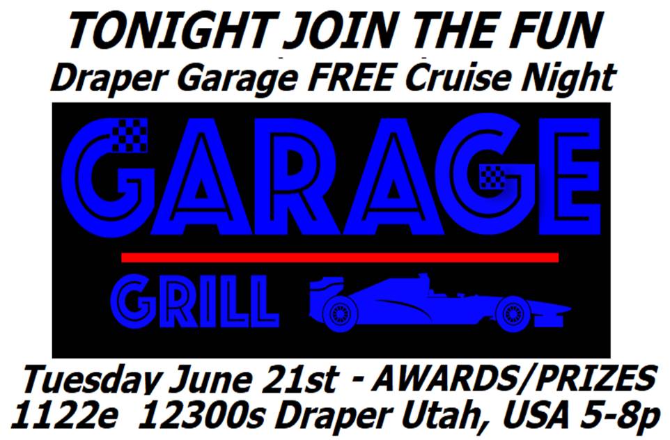 Join us the 4th Tuesday, April thru October for a FREE Classic Car Cruise Night. Draper Utah's Only "Car Themed" Best Restaurant! and Brewery Locally owned; featuring a full menu, Entrees, Salads, Sandwiches, Pizzas, and Sushi. Our full bar offers twenty of our own Salt Flats Beers on tap. Come inside and see our collection of classic and vintage race cars. Join us for the Big Game, Groups, Meet-Ups, Car Clubs, Private Events, and More. DRAPER GARAGE GRILL, FREE CRUISE NIGHT, 1122 EAST DRAPER PARKWAY, DRAPER, UT 84020, (801) 523-3339 See our website for more events.. www.jchackett.com <http://www.jchackett.com> ***** Future Events 21 JUN, TUE DRAPER Garage Grill FREE Cruise Night 1122e Draper Parkway (12600s) 22 JUN, WED Layton Burger Stop FREE CRUISE NIGHT 323e Gentile Rd, Layton Ut. 23 JUN, THU Valley Fair Mall, FREE Cruise night 3601s 2700w 5/8p 24 JUN, FRI Heber Welcome Party 25 JUN, SAT 8/3:25pm Heber Back to the 50's Car Show 250s Main St Heber City Park, Heber City Utah 801-597-3133 26 JUN, SUN Cancelled All Mopar Show 10909s Automall Dr 9a/3p 801-513-4538 Josh 27-28-29-30 JUN, V A C A T I O N 30 JUN, THU Cache Valley 1 JUL, FRI Cache Valley 2 JUL, SAT Cache Valley 4 JUL, MON Independence Day GRANTSVILLE FREE CAR SHOW 5 JUL, TUE LEHI ONE MAN BAND Free Cruise Night 1220e Main Street Exit 279 801-766-0553 6 JUL, WED 5-8p JORDAN LANDING FREE CRUISE NIGHT 3751w 7273s s Plaza Center Drive By Famous Dave's 801-450-4494 7 July, Thurs 5-8p SAMS CLUB FREE Car Show 11248s Jordan Gateway South Jordan Utah 801-545-9801 9 JUL, SAT Copperton Angels Hands Car Show, 9-3, 8690w 10305s, 801-201-5164 11 JUL, MON Legends FREE Cruise Night, LEHI Ut. 5-8p 3661 Outlet Parkway Dr. 385-352-8194 12 JUL, TUE Herriman Garage Grill, FREE Cruise Night 4874w 12600s 5/8 13 JUL, WED 5-8p Springville, LEGENDS FREE CRUISE NIGHT, 1715w 500s 801-489-0889 14 JUL, THU CANCELLED -- GODFATHERS 16 JUL, SAT 9-3p Draper Days FREE Car Show Draper City Park, 12500s 1300e 801-209-9231 Doug 20 JUL, WED Shake Shack, FREE Cruise Night 6123s State St, 801-448-7907 21 JUL, THU 5-8p Live Day Break SoDa Row FREE Cruise Night 11248 kestrel rise rd. 23 JUL, SAT Kamas Kar Show JUNKIE Car Show Kamas City Park, 26 JUL, TUE Garage Grill, Location Pending 27 JUL, WED Layton Burger Stop FREE Cruise Night, 323e Gentile Rd. Layton 28 JUL, THU Valley Fair Mall FREE CRUISE NIGHT, 3601s 2700w 5/8p 29 JUL, FRI Wells Fun Run, 30th Annual, Car-Truck-Motorcycle Show 775-752-1153 30 JUL, SAT Wells Fun Run, 30th Annual, Car-Truck-Motorcycle Show 775-752-1153 31 JUL, SUN Wells Fun Run, 30th Annual, Car-Truck-Motorcycle Show 775-752-1153 2 AUG, TUE LEHI ONE MAN BAND Free Cruise Night 1220e Main Street Exit 279 801-766-0553 3 AUG, WED JORDAN LANDING FREE CRUISE NIGHT 3751w 7273s s Plaza Center Drive By Famous Dave's 801-450-4494 5 AUG, FRI 5pm Evanston Welcome "Pot Luck" Party Hamblin Park Bowery 6 AUG, SAT Evanston 27th Annual Car Show, Hamblin Park, 203 Bear River Drive 9a-3p 8 AUG, MON Legends/Strap Tank FREE Cruise Night, 3661 Outlet Parkway Dr, Lehi 385-352-8194 **** Please do NOT "hit reply" to this email, **** It goes to a mailing service If you would like to email us,, our address is <mailto:jc@jchackett.com> jc@jchackett.com If you know of anyone who would like to receive "Cruise Event Related" information, Simply have them shoot us an email.. They will be added to our mailing list, As you see, it is "blind copied" so others will not get your address.. Please feel free to pass this along to your friends. A Most Important rule to follow.. BE NICE, Think of others, Give someone, ANYONE a SMILE.. You would be so surprised how it will make YOU feel! J.C Hackett Oldies "Rock & Roll Radio" Productions Real Oldies, KCPX Salt Lake City, Utah 84127 www.jchackett.com <http://www.jchackett.com/> Email jc@jchackett.com <mailto:jc@jchackett.com>