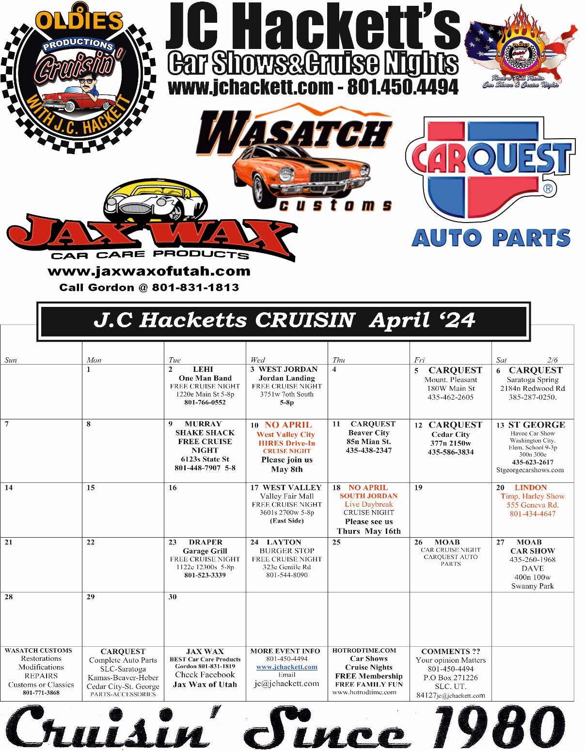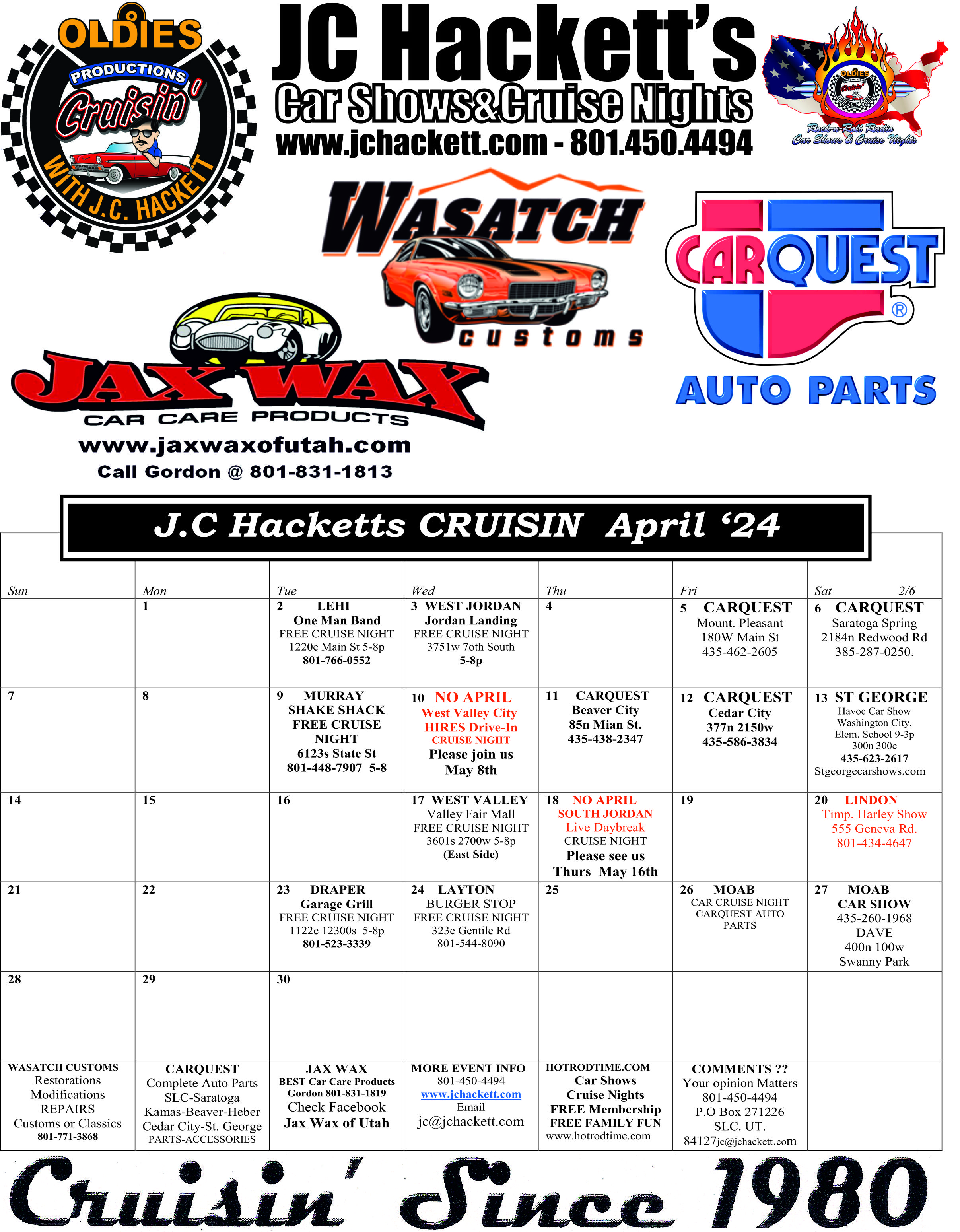 Greetings Everyone ! Well, our "Off Season" is finally over! As April is starting, a reminder ALL events are WEATHER PENDING! Please take a moment to call and verify any event is actually ON and not Postponed! Our sincere THANK YOU to all event hosts and attendees supporting these Family style Fun events. Some of our events date back more than 30 wonderful years! ANY EVENT is only successful Thanks to your support and attendance. As in ANY event or business,, they are entirely dependent on your support! If you want to see them continue, SUPPORT THEM. Now as we are in the beginning of our season, It is also the time to see how many events can be stacked on any single day. Most of our hobbyist's respect events held on an annual date. Many times, City officials see the value in bringing hundreds/thousands Of people to their community, bringing in much needed tax dollars as well as Supporting local businesses. We must be doing something RIGHT for so many to schedule shows! In short, Support those who you want to see continue! Up Coming Future Events. Here is a little list of events we have scheduled.. Anytime you can, Make a plan to join in.. Check our Website for just a few more. <http://www.jchackett.com> www.jchackett.com 31 MAR, SUN Easter Sunday 2 APR, TUE 5-8 LEHI, One Man Band FREE Cruise Night, 1220e Main, 801-766-0552 3 APR, WED FREE CRUISE NIGHT 5-8 West Jordan, Jordan Landing Cruise Night, 3751w 70th s, Across from the RUSH Complex 5 APR, FRI Carquest FREE Cruise Night, Mount Pleasant Utah 180w Main St 435-462-2605 6 APR, SAT Carquest Free Cruise Night Saratoga Springs 2184n Redwood Road, Saratoga Utah 385-287-0250 9 APR, TUE MURRAY, Shake Shack Cruise Night, 6123s State St. 801-448-7907 NO APRIL Hires Cruise Night West Valley City, HIRES Drive-in, 2900w 4700s 801-965-1010 (See you May 15) 11 APR, THU Beaver City Utah Carquest FREE Cruise Night, 85n Main St, 435-438-2347 12 APR, FRI Cedar City Utah Carquest FREE Cruise Night, 377n 2150w 435-586-3834 13 APR, SAT St. George HAVOC Car Show, Washington City Elementary, 300n 300e Win 2 Jet Blue Tickets to ANYWHERE they fly!! 435-623-2617 <http://www.stgeorgecarshows.com> www.stgeorgecarshows.com 15 APR, MON Tax Day 17 APR, WED West Valley City, Valley Fair Mall Cruise Night.. 3601s 2700w, East Side NO APRIL South Jordan, Live Daybreak, SODA ROW Cruise Night, Hope to see you May 16 20 APR, SAT **PENDING** LINDON, Time Harley Car/Truck/Bike Show 555 Geneva Rd. 801-434-4647 23 APR, TUE DRAPER, Garage Grill Cruise Night, 1122e 12300s 801-523-3339 24 APR, WED LAYTON, Burger Stop Cruise Night, 323e Gentile Rd. 901-544-8090 26 APR, FRI 4-7p Moab Carquest FREE Cruise Night 1010s Main St 435-259-2413 (South-East end of town) 27 APR, SAT Moab 1 MAY, WED West Jordan, Jordan Landing Cruise Night, 3751w 70th s, 3 MAY, FRI Page Arizona, Welcome Party and Cruise, Page Lumber store, 928-691-0042 4 MAY, SAT Page Arizona Warren Whistler Memorial Car Show, Page City Park, 600n Navajo 928-691-0042 <mailto:capage@yahoo.com> capage@yahoo.com **** Please do NOT "hit reply" to this email, **** It goes to a mailing service If you would like to email us,, our address is <mailto:jc@jchackett.com> jc@jchackett.com If you know of anyone who would like to receive "Cruise Event Related" information, Simply have them shoot us an email.. They will be added to our mailing list, As you see, it is "blind copied" so others will not get your address.. Please feel free to pass this along to your friends. A Most Important rule to follow.. BE NICE, Think of others, Give someone, ANYONE a SMILE.. You would be so surprised how it will make YOU feel! CHECK OUR WEBSITE FOR MORE 2024 EVENTS <http://WWW.jchackett.com> WWW.jchackett.com J.C Hackett Oldies "Rock & Roll Radio" P.O Box 271226 Salt Lake City, Utah 84127 <http://www.jchackett.com> www.jchackett.com 801-450-4494
