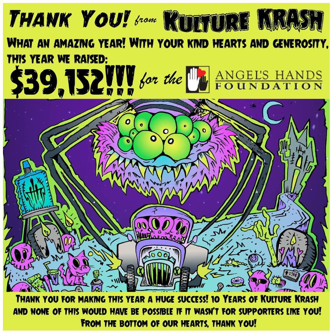 Greetings Everyone This is a COPY of the post by Kulture Krash And Andy Kawahara (Read on) Yesterday was so phenomenal, THANK YOU for coming out and supporting Kulture Krash 2024 this year! It was wonderful to see everyone, we had beautiful weather and an amazing turnout of 409 cars! $$ 39,152.00 We are honored to be a part of a community that comes together and unifies for a great cause. This magic didn't just happen overnight, it's been 10+ years in the making and none of this would be possible if it weren't for people like you! Each of you plays a part, some of you have been with us since 2014, and for others this year was your first, Thank you for choosing to spend your day with us. Thank you to all of our Krash Krew, Angel's Hands Team, Angels Hands Families, Artists, Sponsors, Donors, Vendors, Car Owners, Car and Art Enthusiasts. It takes a village, and we truly have the best of the best. We hope you enjoyed show as much as we did! Reprinted Post from Andy Kawahara.. <https://www.facebook.com/andy.kawahara.5?__cft__%5b0%5d=AZWMVtYLRsgu5-UaKI3 H4UDbMeDNq-CPBE4BrCrPz3KZkPH7QU0optzYuQtg9NU-d1gg-4A751bXzbKIAsZCx0i1KCSs2gR MhJOjcIVzqv_LXVU0v_80es88T4KmE5m9NluXib1F8NmtOWGy3cjI35wdeomQK9gSSiWxRhfnG7Q Gvw&__tn__=-UC%2CP-R> Andy Kawahara . I have a gratitude so deep i cannot express it with words. A group of friends decided to carve out their own trail about thirteen years ago, and start something pretty cool Kulture Krash was born. In that time, this merry band Misfits has lead by example, and been the change that we all so desperately want to see. I have been able to stand shoulder to shoulder with people who have become family. People who would do anything for me, and me for them. Building something like this hasn't been easy, but anything worthwhile never is. Late nights, long days, so much going on behinds the scenes that no one ever sees, and few appreciate, but all of that time, that sacrifice has gone on to create something pretty special. I mean, it's almost funny at this point, but I literally had at least a hundred people come up to me yesterday and tell me that KK is their favorite show of the year. From families all walking around in their show shirts, art collectors, car owners, kids dressed in costumes and so many more. It's easy to become apathetic to it, and forget what all of this means to so many. I got word today, that through all of your generosity, we raised FORTY THOUSAND DOLLARS yesterday! I couldn't help but get emotional. We have been blessed every year to make more for our charity then the year before. That simply doesn't happen. I don't even know how to quantify that level of humanity. There has been something in the air for awhile now. You can feel the tension from everyone around you. This nation is divided, probably irreparable. The divisive and ugly rhetoric, the "us vs them" mentality, the way we communicate to each other, and the things we choose to share online. It's made people mean. I didn't feel any of that yesterday. What a beautiful gathering of the very best of humanity. A celebration of life, love, family, art, hot rods, and some really special kids. I've said it before, on the shoulders of giants I stand. Without this group of people who I love, I really don't think I would have made it this year. We did something good yesterday. It is life affirming. One thing that I have taken from my mama, and believe completely is this. The heart that gives, gathers. We have made a difference. Thats amazing. Family is everything, and life is beautiful. Thank you to everyone. AK~ This all has been said, .. Perfectly J.C
