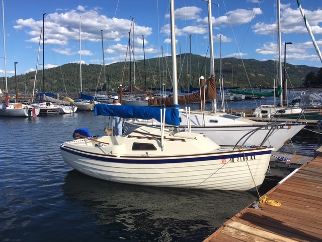 Boat Name: Nothin's Ez Location: Coeur d'Alene, ID Seller: Scott Description: Hull# 366. Boat has been restored and in good shape. Sails are in good shape. Cabin cushions replaced; sun canopy; 2017 Tohatsu 6 HP 4-stroke engine with about 40 hours; vented boat cover; Trailer has 4' adjustable tongue extension for SUV/Car towing; motor mount added on trailer; a reliable keel guide for boat on-center with trailer roller; replaced trailer bunk boards. Have a lot of pics if interested. Price: $8000