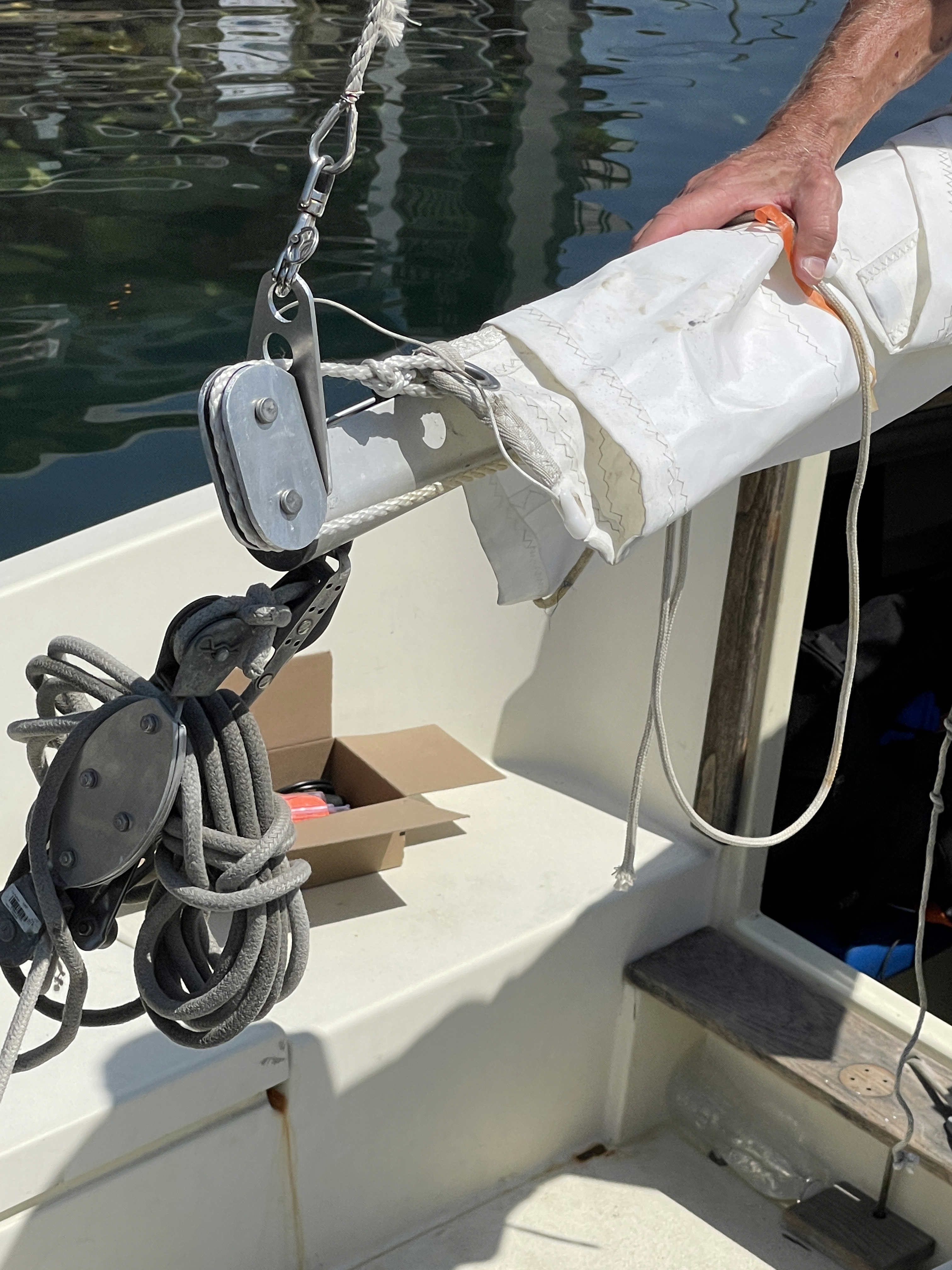Seeing these responses now as I catch up on house stuff (sadly our mountain reservoir really drops away late in the irrigation season, meaning we have to pull the boat by labor day or risk having it stuck in the mud all winter...). The vang come into play as soon as you start loosening the main sheet- with the vang the sail swings like a door and keeps its controlled shape; without a vang even a few inches of letting out the main sheet (as soon as the sheet is not pulling straight down) the shape of the sail starts to change as the boom lifts and the leach curves- - the sail quickly loses its wing shape and bellies forward, with the top part twisting further out than the bottom part of the sail. That said I've spent many happy hours sailing our M15 without one- telltales and a good outhaul are way cheaper tweaks to start with! Re outhaul- here's my basic rig- except I used an old block without a becket, so just tied the line to the boom end fitting, out through sail, back through block and to cleat- nice 2 part purchase that makes it easier to make fine adjustments under sail- way better than just tieing the sail to the boom end fitting as was the previous set up. Happy sailing all! [image: image.png]