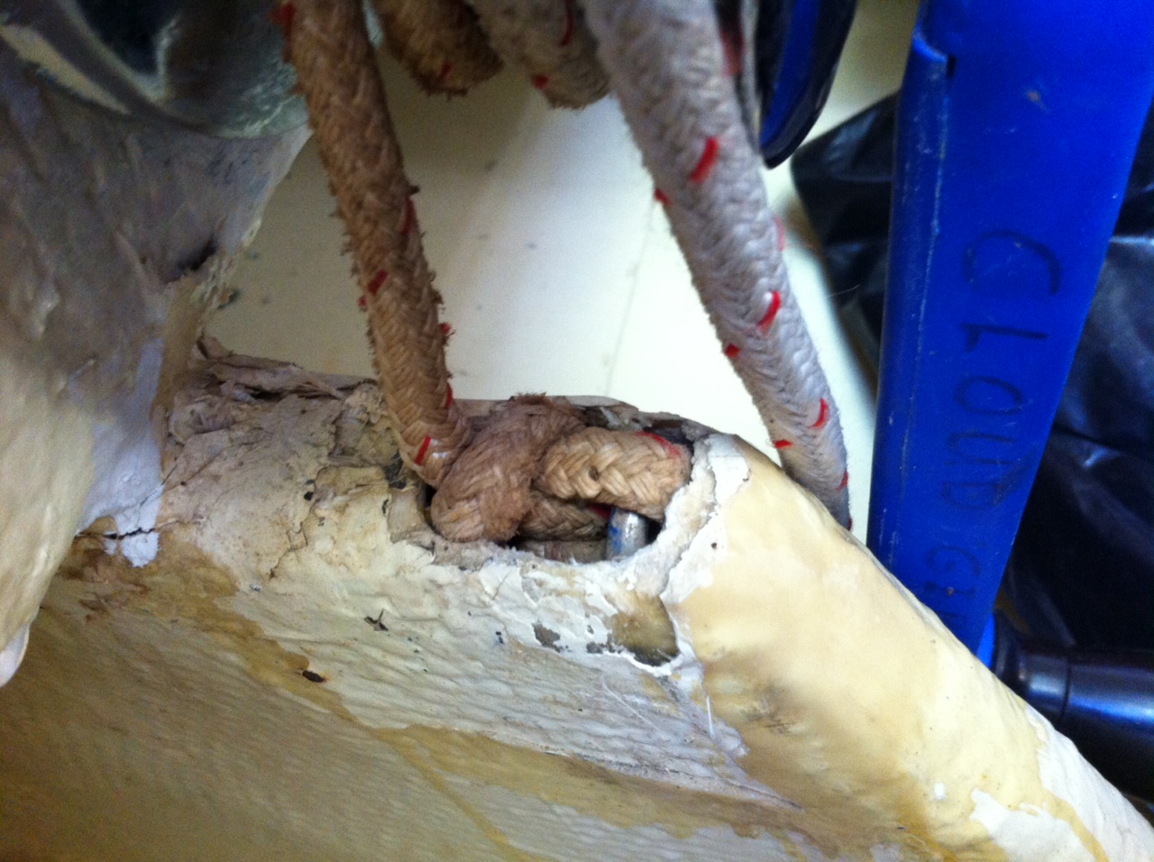 Becky, The PO sounds like they have a good plan - From here, it looks like the shackle is the real culprit. Not the knot. May be that the shackle has been forced thru the trunk by the trailer keel roller? Looks like the knot 'came along for the ride'. Remove core from new uphaul line (double braid dyneema would be good choice ) and use shorter smaller shackle (that one in photo looks like 5/16 or 3/8 galv bow shackle - like anchor chain type).Splice to shackle - repair trunk -Remember the board weighs < 200# so search out a good properly shaped and smaller shackle for the application. (narrow 'D' type shackle) I don't think a sleeve on the trunk will do much for the 'squirt factor' - beware chafe at the uphaul pennant. (we use a paper towel tightly wrapped around uphaul - cheesy- but meets all criteria and no chafe - in the past we employed a shop rag - years ago - til 'someone' winched it onto the drum and made quite the nutfudgecluster) A piece of innertube material with a slit in center - glued to the top of trunk over the hole works too - use 3M weatherstrip adhesive. Go get this finished up so you can start sailing! ! Good luck, Have Fun, Go Sailing! GO I replaced my CB pennant/uphaul for the PO when I was 'in the boat biz' about 24 years ago -don't remember if I spliced it or knotted it - I will post the day it fails - does that fall under 'deferred maintenance" ? In a message dated 4/10/2014 6:53:07 P.M. US Mountain Standard Time, becky@beckybelding.com writes: I would really appreciate some advice on the methods of repair for my centerboard trunk... I was really fortunate to make contact with a past owner of my boat (He sold to the fellow I purchased from) and shared that in approx 2009 the tang broke off and had it welded up to size. He suggested I have the shackle replaced with a shorter one and have the pennant property spliced on. The knot is responsible for the damage to the centerboard trunk and suggested repair and to have a "sleeve" put on it to keep the water from spurting up through the hole. I plan to have her bottom painted and will have the centerboard dropped and inspected. I would really like to understand what might be necessary in terms of repairs by seasoned Montgomery owners. I hope that some of these repairs I can learn to do myself. This past owner did not have problems with centerboard/rust and I am hoping this is still the case...she was not inspected when I purchased from out of state. Thank you! Becky Two photos attached Sent from my iPad