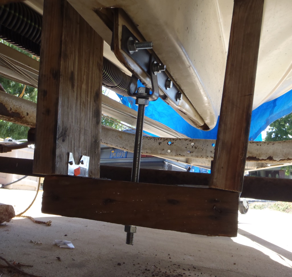 On my M15 I tried hammering a rod down from the top, and it caused a lot of damage to the inside of the centerboard trunk that took a lot of work to fix once I got the keel down, but it didn't move the centerboard at all. I would really strongly recommend against continuing with that course of action. What worked for me was building a puller and pulling down from the bottom, per a design posted by Captain Jim Sadler on this board. I am attaching the photos of the puller I made with just a dremel and standard hardware store parts. Sincerely, Tyler ----- Original Message ----- From: "James Hymes" <jamesehymes@gmail.com> To: "For and about Montgomery Sailboats" <montgomery_boats@mailman.xmission.com> Sent: Monday, March 4, 2019 2:12:02 PM Subject: M_Boats: Possible solution for stuck centerboard My CB has been stuck the past several times I've taken her (#69 M17(Not Coyote- I believe the boat named Coyote has the same number as mine, but was modified for racing - doesn't have a full cabin--but that 's not important right now). anyways, I drilled a 3/4" hole in the cockpit floor just aft of the doorway into the cabin above the CB . Drilled it there so that the steel rod will have good contact with the top of the stuck CB. I used a steel rod and a 10 lb sledgehammer, floated the boat but kept it on the trailer at the boat ramp. I was able to lower the CB a little, didn't have the motor so didn't want to have to struggle getting the boat back on the trailer in the wind - since it was not in open water I didn't get to see if it would drop all the way, will find that out next time. The last time I did sail with the CB up, it was too windy, and I was uncomfortable with the amount of heeling it did and also didnt point so well. I'm extremely hopefull the CB will drop all the way, cause if not I'll take ti and lift the boat on land and try wiggling the CB out while hitting it from above, may have to get drastic and cut open the keel and dig out the old steel slugs and replace with lead ballast - something I hope to avoid. If it works out, I'll put in some sort of plastic with a removable cap for the steel rod to fit into. I'll repost to let ya'll know if the sledge works. Jim in Denton Texas