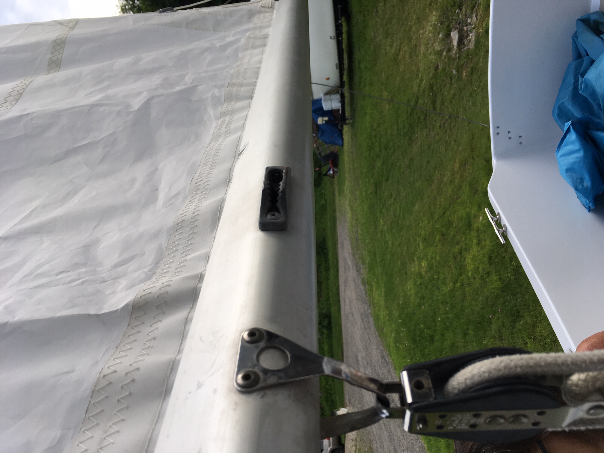 Since your boat is similar vintage to mine (#38, 1974) I suspect your OEM hardware has similar use to mine. Your mainsheet block bail looks identical. Your tack reefing strap eyes and clamcleats look identical also, though mine are placed somewhat differently (closer to each other, staggered vertically, and close to mast track/aft edge of mast rather than forward more on mast). Looks like your mast has a bent mast gate opening that is below gooseneck. Mine has milled (cut out) opening that is above gooseneck. My halyard cleats are euro-style shape and placed at 90 degrees on side of mast rather that towards aft edge of mast (cleats identical to your halyard cleats were the original jib sheet cleats on my boat). The small cheek block and small clamcleat on port side of your boom are for a topping lift. The line (I'm using 3/16" single braid polyester) is fastened to the aft portion of the masthead casting, on the port side, runs down through the small cheek block, and forward to the clamcleat. That small a cheek block would not be installed for reefing the main and as Dave said the clew reefing lines for mainsail are normally on starboard side. I moved my small cheek block for topping lift aft, as it was IMO too far forward on the boom. Yours looks more aft than mine was originally, but hard to tell from close-up. My boom has two larger cheek blocks on starboard side for clew reefing lines (and had two horn cleats also, which I replaced with clamcleats). Doesn't look like yours has any of that on starboard side? So I've no idea what that eye strap type thingy on your starboard side is for. Nothing like that on my boom. Mine has a short line with spring clip attached to the backstay splitter ring, for clipping to the rear of the boom when the boat is rigged up but 'asleep'. I also use it to hold the tiller up out of the way when not sailing but using the cockpit space (at anchor, in a slip, whatever). cheers, John On 6/24/19 5:48 PM, Gerry Lempicki via montgomery_boats wrote: