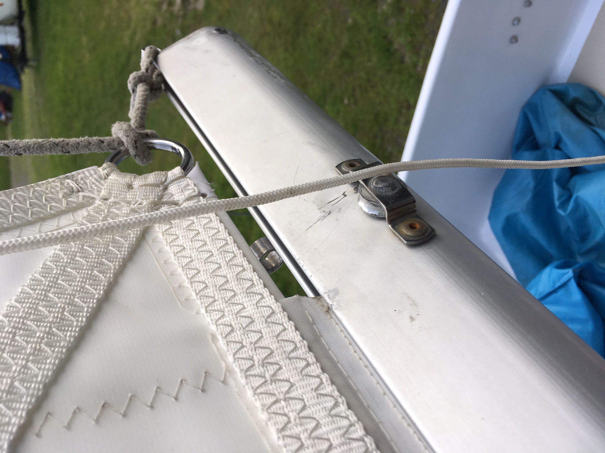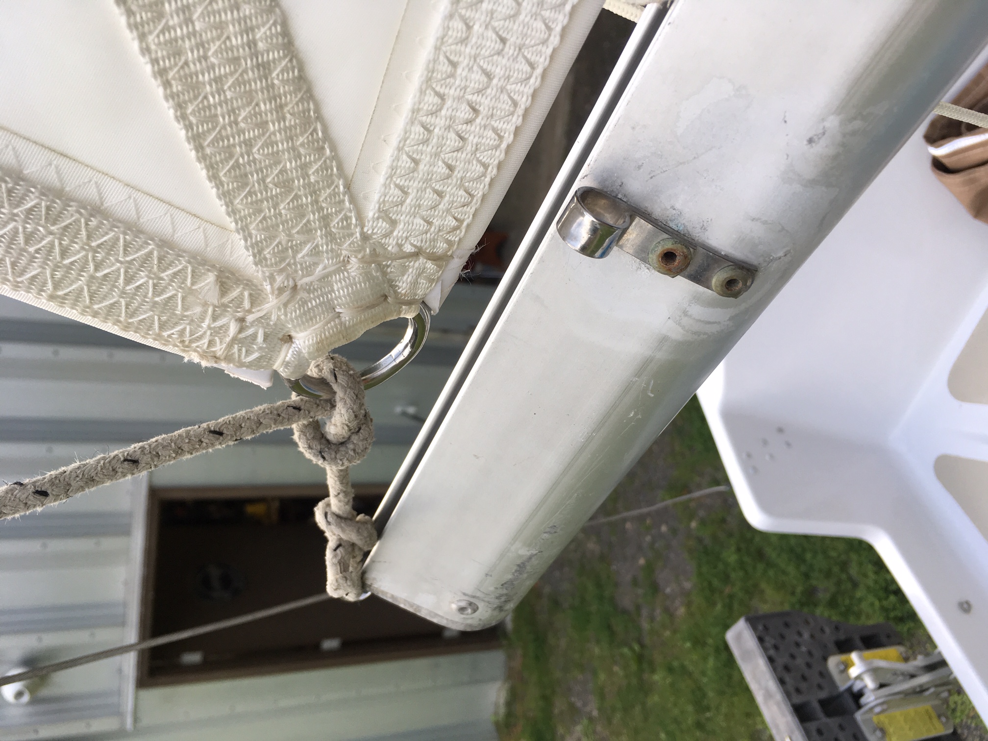 Now for a couple questions regarding boom hardware. I'll attach a few photos. When I got the boat, there was this short line tied at the rear of the boom. I've been using it to support the boom when the sail is not up (by tying it to the ring at the split in the backstay). Is this same line used to tension the sail foot by pulling it back? Or maybe some of the hardware on the boom is used. I'll attach as few photos of the boom showing both sides. Can anyone tell me what the hardware is for? Thanks very much for any input! -Gerry