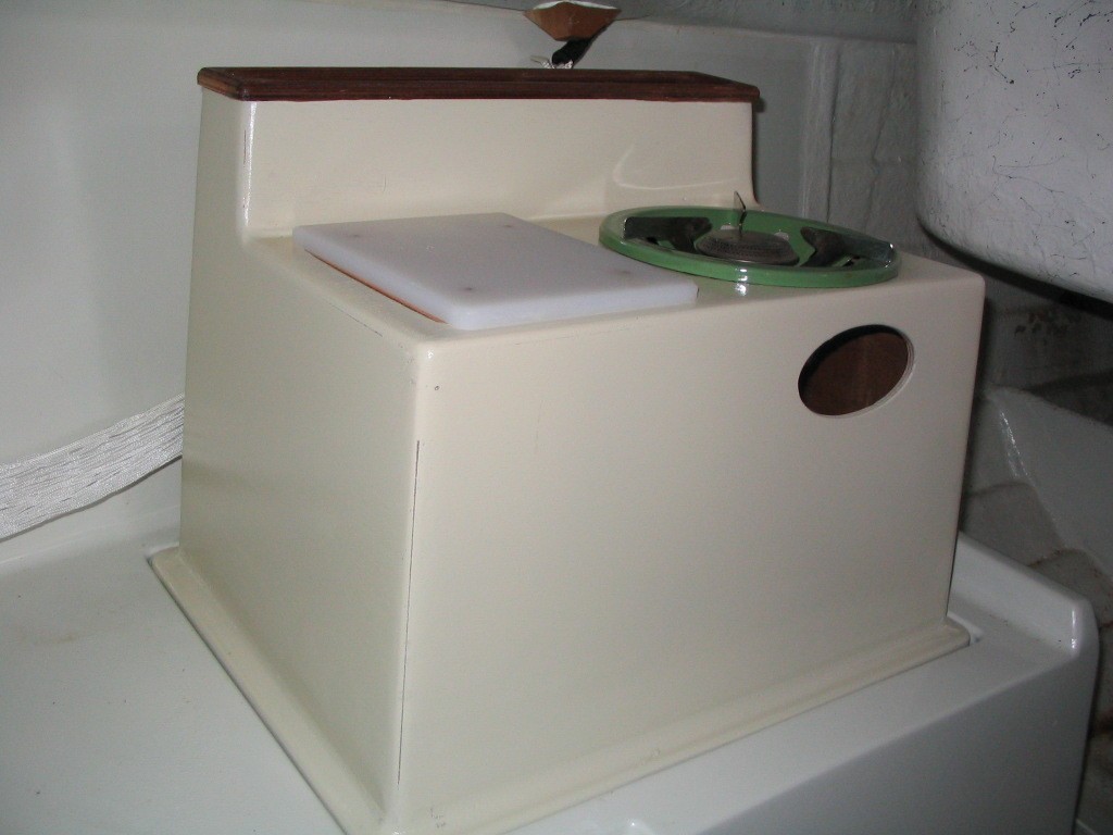 Previous owner (John Harris, Chesapeake Light Craft) made the attached for "Chimpanzee". Burner and direct-connect 1 lb. propane bottle lift up. Never used it myself, but it's neat. Only wish it had been sized/shaped so it could be stored inverted in the under-bunk access as well as sitting upright in it.