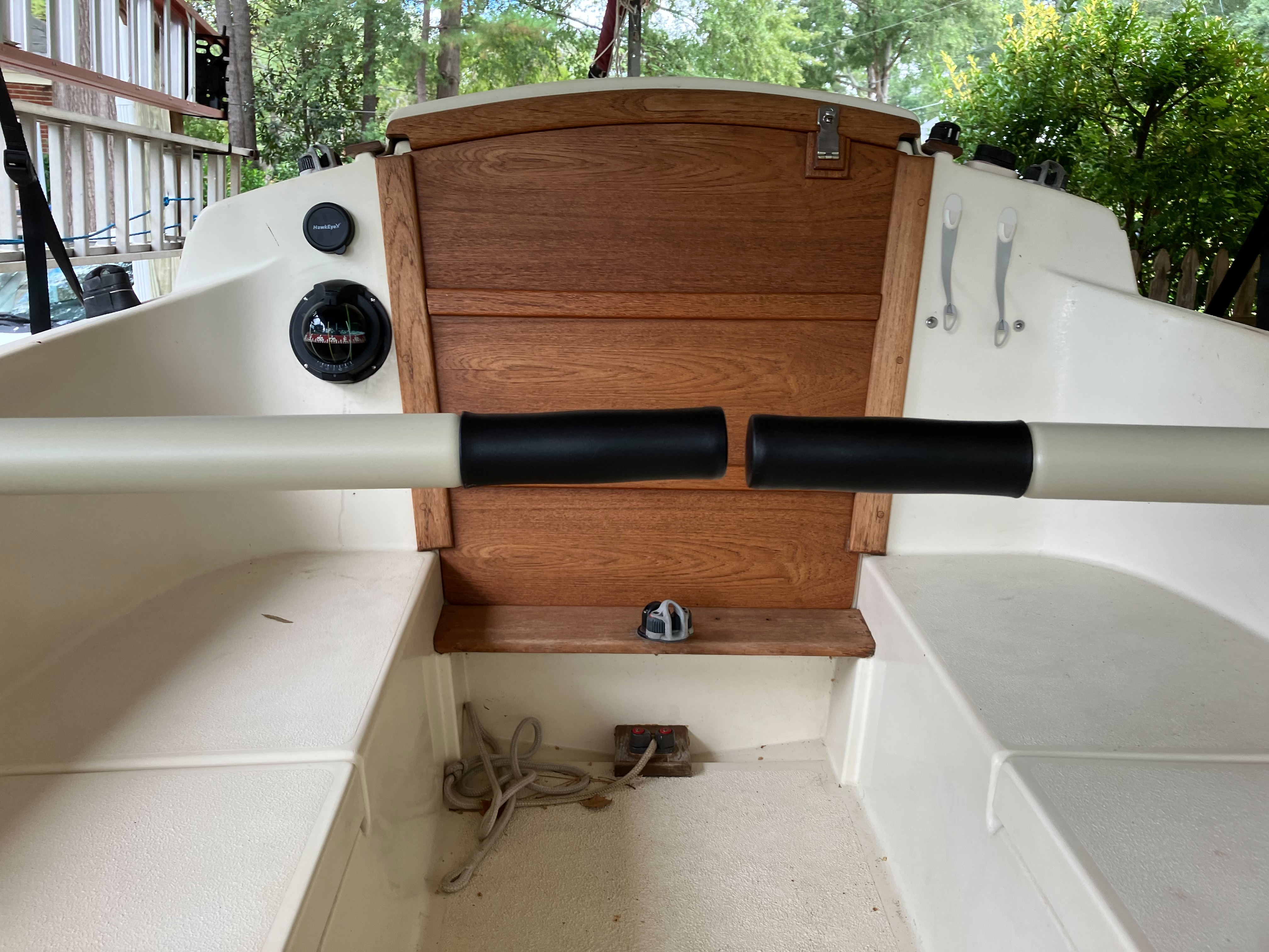 I have set up a sculling option on my M17, using the Scullmatix device (https://duckworks.com/scullmatix/) with oarlock on starboard portion of transom, but so far have only been able to try it with an oar that is at least several feet too short. I was able to move the boat around a bit in glassy conditions, despite the awkward angle and low effectiveness with the too-short oar. A long enough oar would clearly work better, and, then there's the issue of stowing a long enough oar on a small boat. It would need to be a two-piece oar to stow inside anywhere (the R2AK M17 stowed their long sculling oars outboard of the toe rails when sailing IIRC).