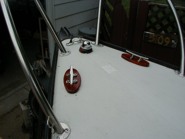 Very nice, Bones, Elevating the cleats off the deck allows you to get your hands down there and work the line around the horns. This is on my list of things to do also. Nice to see how good it will look when I am done. Is your anchor roller stem head fitting a custom casting? Want to do that also to mine, looks like another great idea. I wonder if installing a bail over the anchor rode notch so as to keep the line where it belongs on the sheave would be worth it. Perhaps a ss strap with a delrin wear collar underneath it for chafe protection of the rode. Fair winds Tom B On Sat, Mar 8, 2014 at 1:44 PM, bownez@juno.com <bownez@juno.com> wrote: