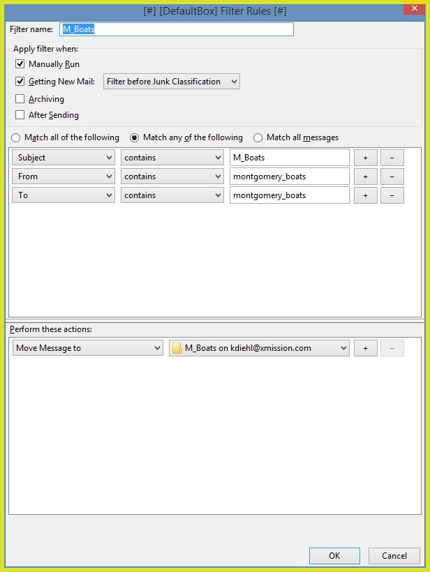 Hi Keith, thank you for the suggestion. At this point, I think I'll just go away from the list for a while. If I find myself really missing the conversation, I'll be back. Please UNSUBSCRIBE, if I am doing that correctly.. Thanks and best wishes. John Lubliner -----Original Message----- From: Keith Diehl <kdiehl@xmission.com> To: jslubliner <jslubliner@aol.com>; For and about Montgomery Sailboats <montgomery_boats@mailman.xmission.com> Sent: Wed, Feb 24, 2016 10:57 am Subject: M_Boats: UNCLE or How to Handle List Mail John, I hate to see you leave. Let me offer a suggestion about how I handle list mail. I created a mail folder just for Montgomery Boats mail, and created a rule that put any mail with M_Boats in the subject into that folder. Most all mail programs have a simple way to create rules or filters. (I also get administrative messages from the list, so the attached picture of my rule has a couple extra conditions) At my leisure, I sort by subject, scan the contents of the folder, and read what I want. CONTROL+A (in Windows) selects all of the messages in a folder, so a single press of DELETE can get clean out the folder. Some mail programs also use a right click on the folder to offer a delete all popup choice. Please give that a try and see if it helps before leaving us. Keith Diehl On 2/24/2016 8:54 AM, jslubliner--- via montgomery_boats wrote: