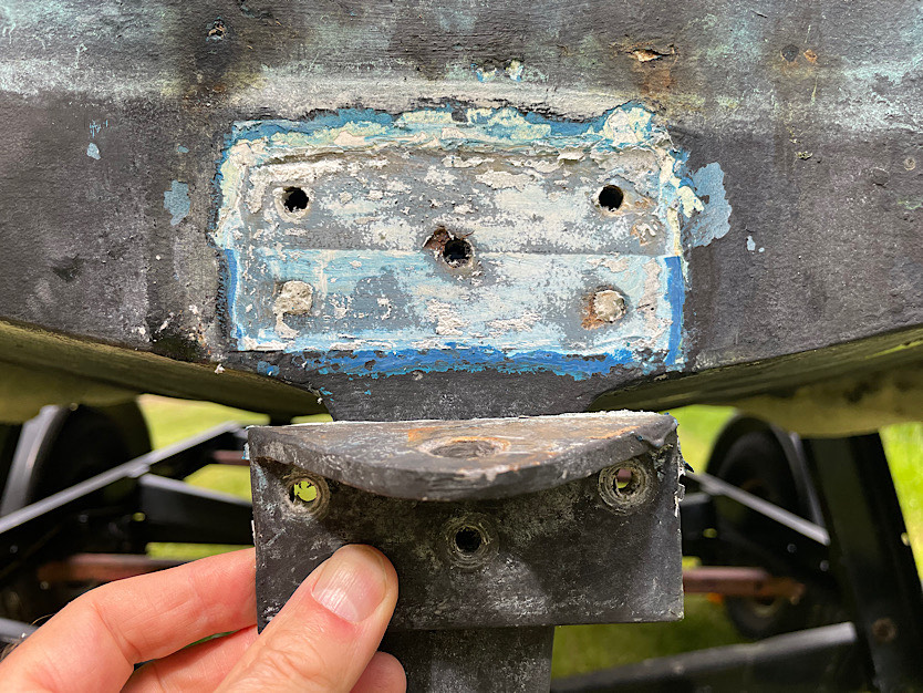 I removed the bottom rudder pivot bracket to find that silicon was used to bed these bolts and water has likely been seeping in for a long time. The wood in there is now essentially earth.