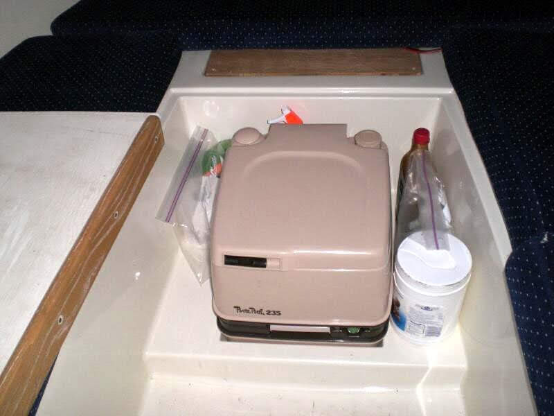 Porta potty - I use a regular RV style porta potty which sits in the cabin when the bed is put away. When sleeping, the porta potty is in the back of the boat. I actually use it, sitting comfortably out in the open but hidden under the tent-like tarp, even in the marina. No one can see under the tent.