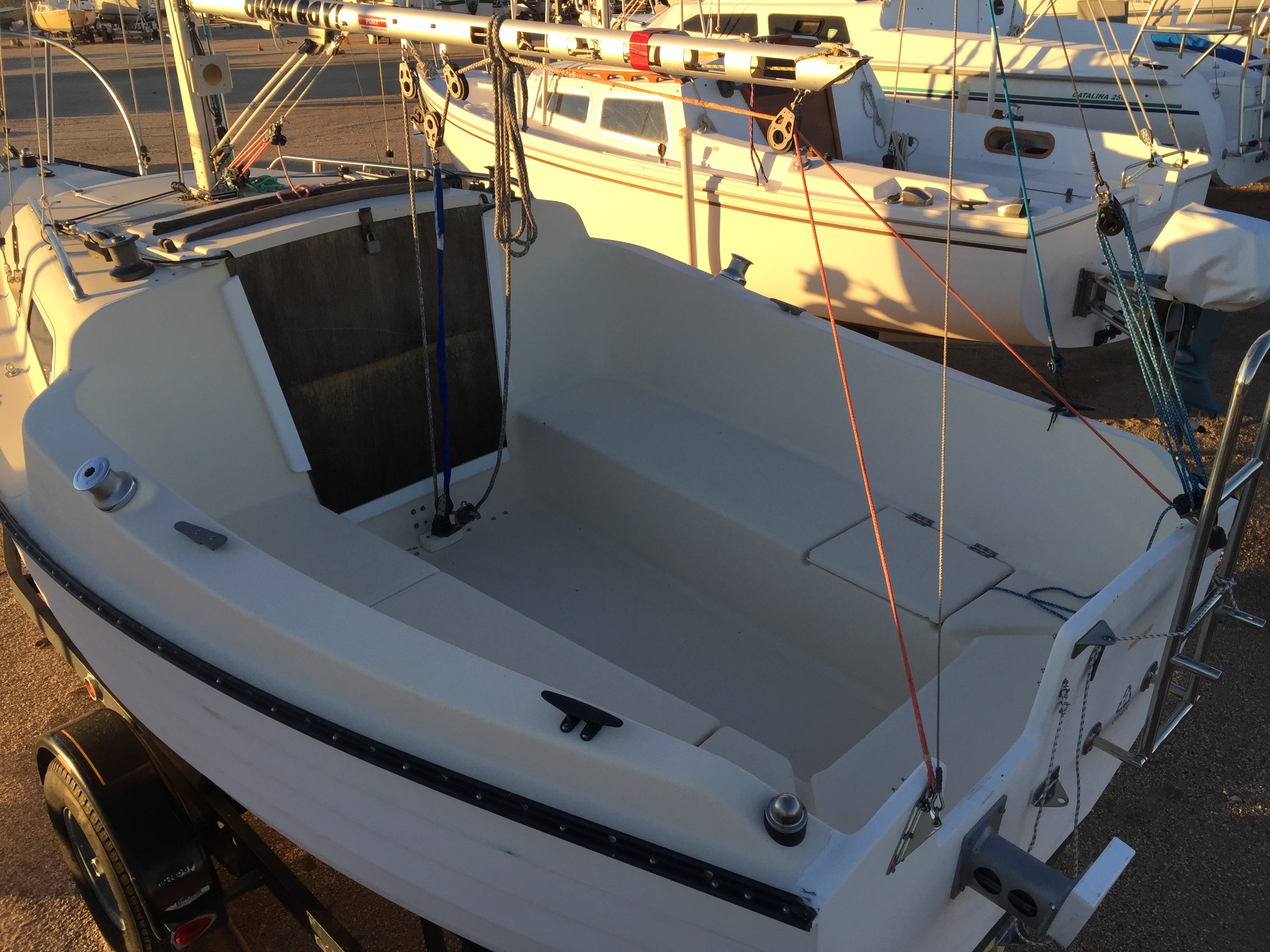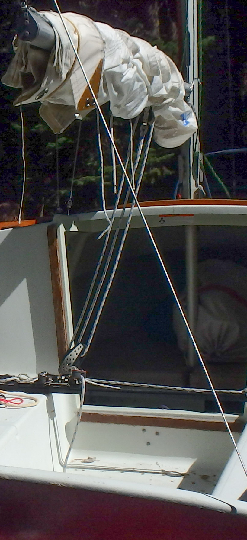 ...and here's a poor quality but legible pic of how it was when I got it, you can see the original 3:1, becket on boom block. Still had the crazy 4 ft. traveler rail mounted on seats across cockpit blocking companionway and best sitting location. cheers, John On 7/22/19 6:57 PM, John Schinnerer wrote: