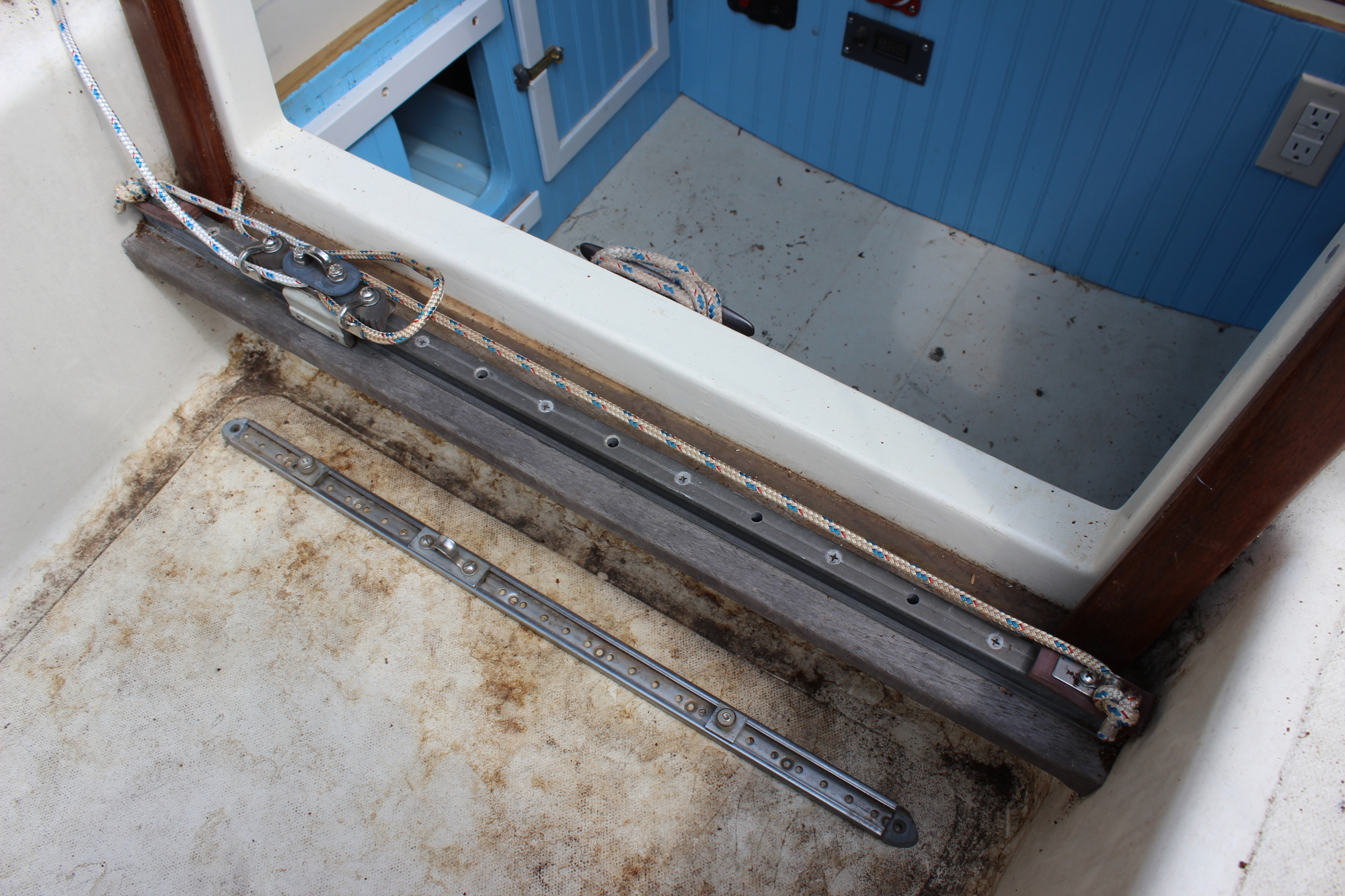 John, yes that hardware/set of 3:1 blocks look very similar to mine, with exception of the high track which I assume was a previous owners modification. I see and understand how your 4:1 system is working. Thanks for posting those photos and explaining all. I was just reading up on the Harken 4:1/8:1 swivel base system. I bet that would give Robin the best options for controlling the main, but I bet it is $$$. I haven't totaled it up (and it is more to work around in the cockpit). I would think just going to 4:1 would be a big improvement for her. But I am also thinking ahead; there are other women in the club here, and it would be awesome if I could set it up so they are comfortable taking it out without one of the guys (to haul in the main). I've already seen that they are very competent sailors, but at 3:1 in a good breeze it is physically demanding.Gerry On Monday, July 22, 2019, 10:05:58 PM EDT, John Schinnerer <john@eco-living.net> wrote: ...and here's a poor quality but legible pic of how it was when I got it, you can see the original 3:1, becket on boom block. Still had the crazy 4 ft. traveler rail mounted on seats across cockpit blocking companionway and best sitting location. cheers, John On 7/22/19 6:57 PM, John Schinnerer wrote: