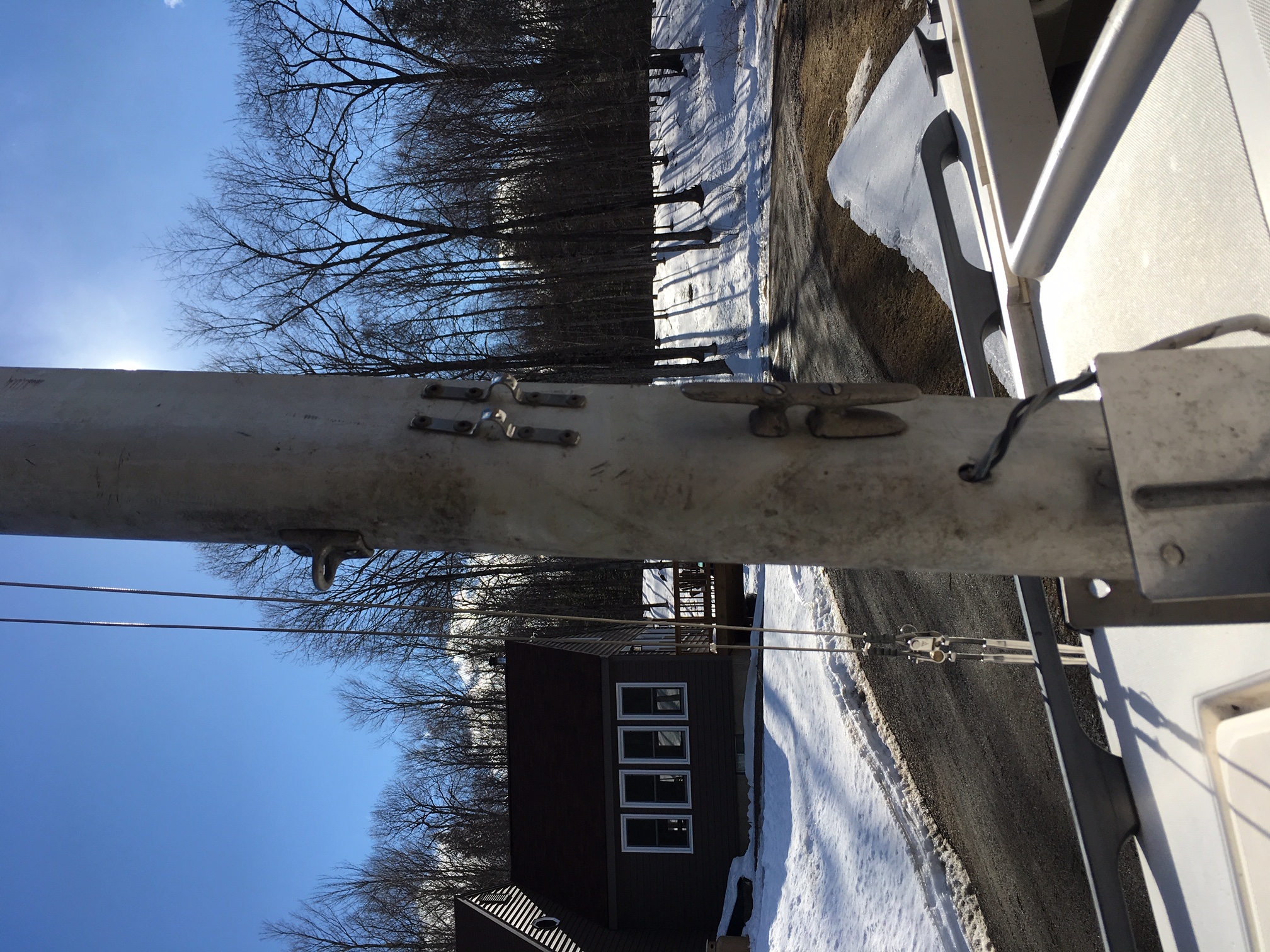Looking at the original mast, someone mounted strap eyes on the port side and jam cleats on the starboard side. Any idea what these might have been used for? I have not mounted any on the new mast yet. There are permanently mounted blocks on the deck to redirect the halyards to the cabin top near the companionway. -Gerry