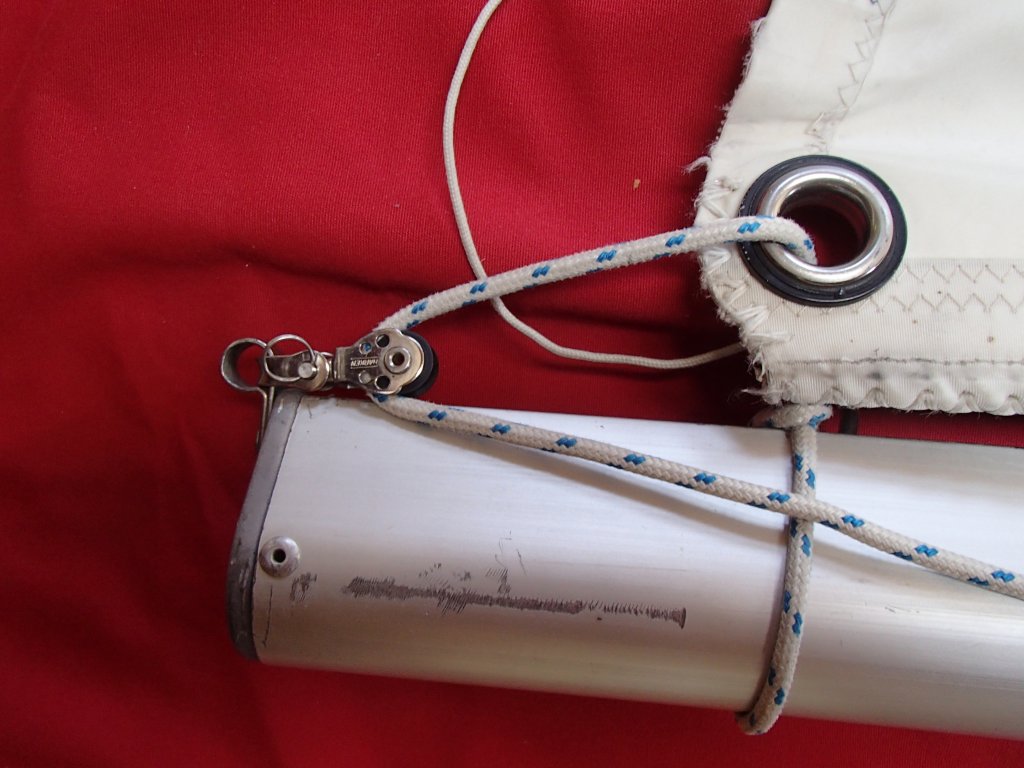 If you just tie the line to the clew reefing grommet and then down through the block you don't need that of course. It's only needed for running the line 2:1 from port side thru grommet to block on starboard side.