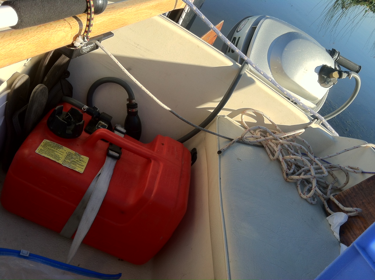We happen to be out on the California Delta for a few days and are using our standard refueling system described a few years ago on this group. I am attaching a photo that I hope comes through. We use a 3.5 gallon gas can with a bulb pump attached to a gas cap on the motor that was sacrificed to have a hole drilled in the top for a fitting the hose from the bulb is connected to. When the motor starts to run out of fuel, we pump around 35 times to fill it up again. You can fill it before it runs out too. The gas can is secured in the back of the cockpit. We've refueled easily in rough conditions with the only spillage being what squirts out the vent hole I drilled when it's full. I wish there wasn't 3.5 gallons of gas in the cockpit with us, but I think it is the best place overall. This system has worked well on week long cruises. David Grah Bishop California Montgomery 15 - Sky Sent from my iPhone Sent from my iPhone