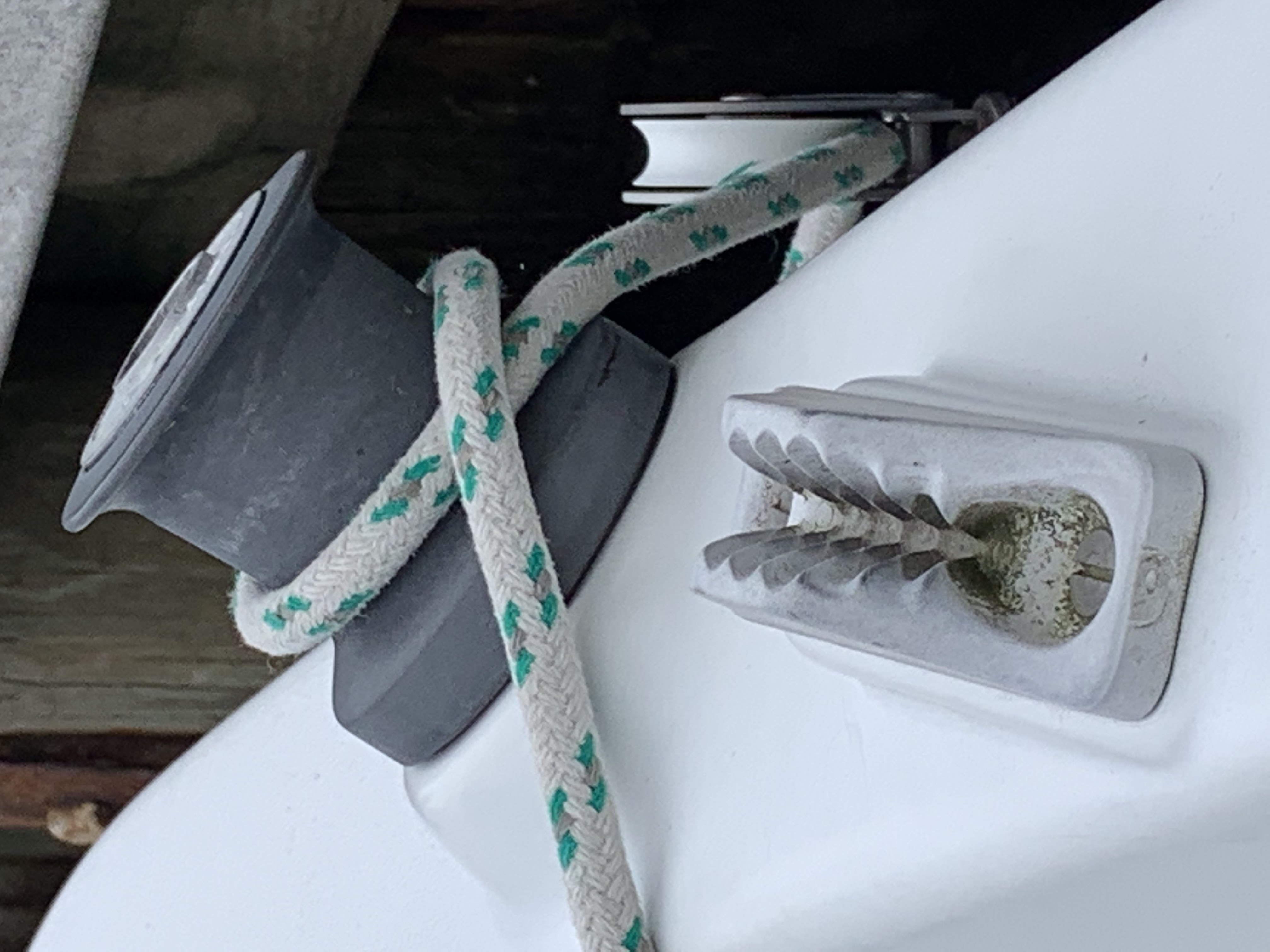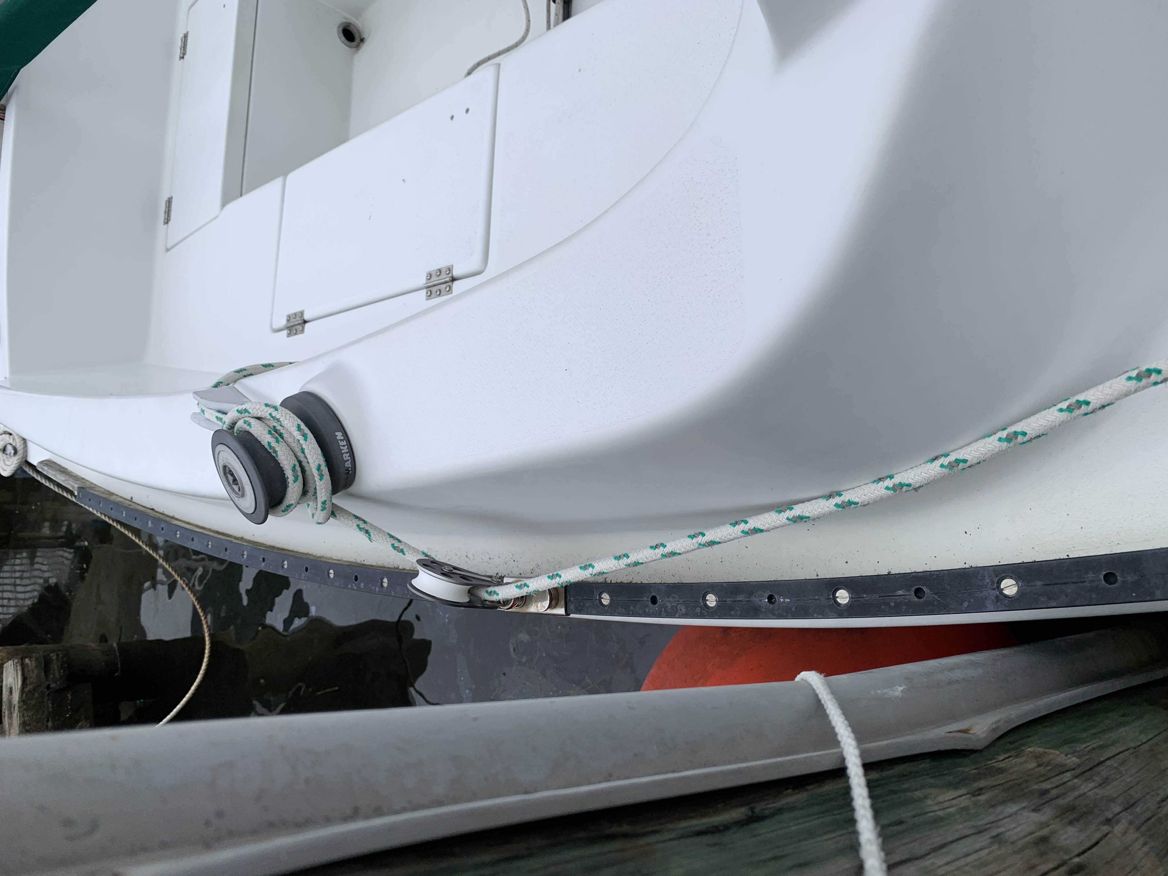 With the sheets quite a bit further behind, the sheet will cross over on itself. Different on the one side than the other due to both winches turning the same way, so the sheet wraps outboard on one side but inboard on the other. When I was using the original hank-on genoa, which was a 'sweeper' (cut low to deck), my blocks were still enough forward of the winch. When I got the furling cruising jib (higher cut) they had to be back behind the winch a fair bit, and the sheet would interfere with itself somewhat. I never used the winches with a handle to actually trim the jib. I just took wraps on them from habit from larger boats. Most of my sailing so far has been lakes where I'm tacking fairly frequently, so it is just a hassle to wrap on and off the winches. I've since switched to using swivel cam-cleats for my jib sheets, with blocks on soft shackles thru toe rail (I have the older aluminum toe rail, full of holes). The blocks are pretty far aft due to the cut of the cruising jib (I posted some pics long ago). Solves the sheet crossover problem for sure. As someone pointed out at the time, the sheet could still run to the winch after the swivel cleat if needed for purchase to trim. I just luff up quickly if necessary to sheet in jib. Henry on Monita did something similar, slightly different hardware, before I did, that's what got me thinking it was viable. cheers, John On 8/3/21 1:27 PM, Bob Eeg wrote: