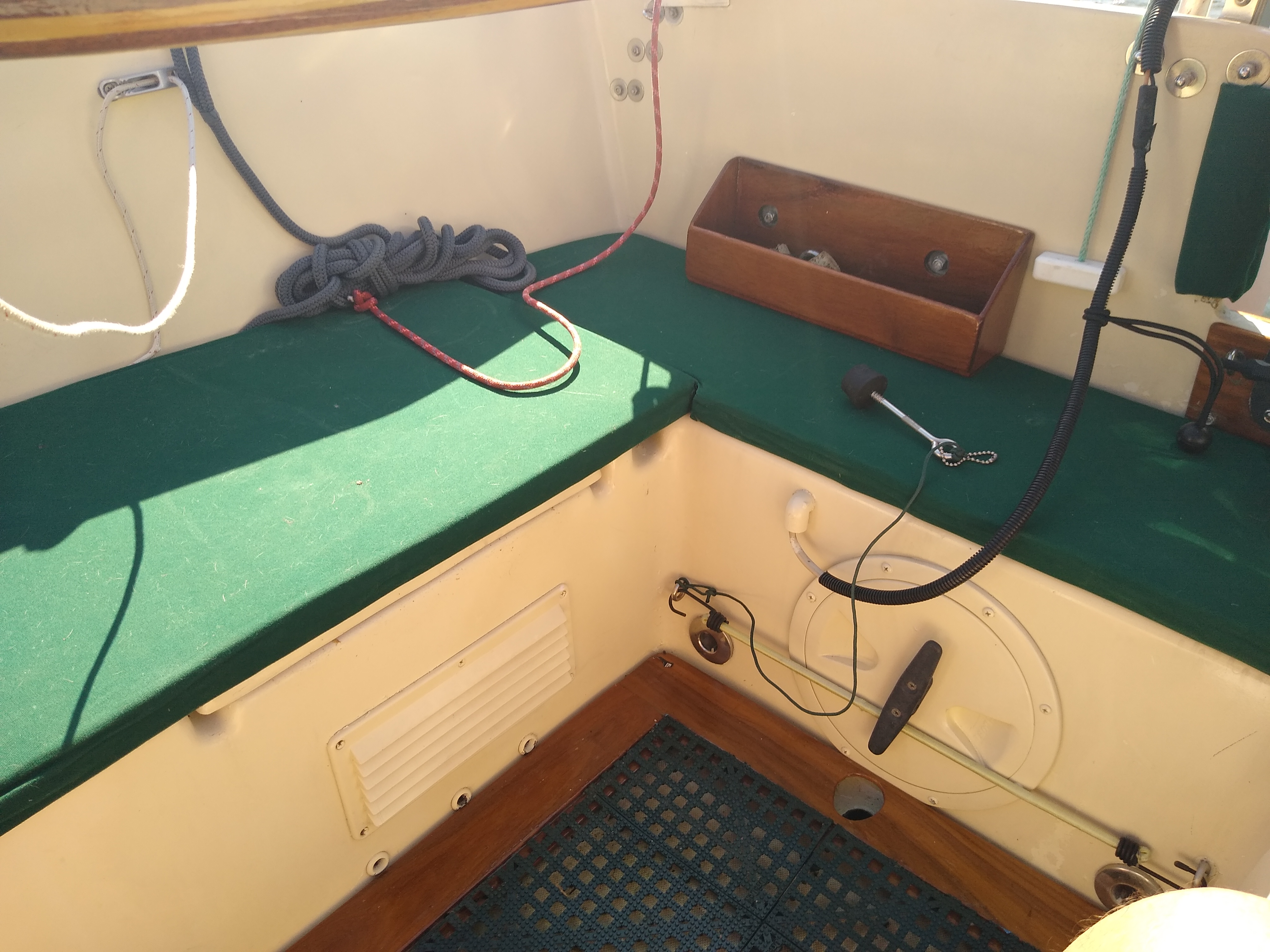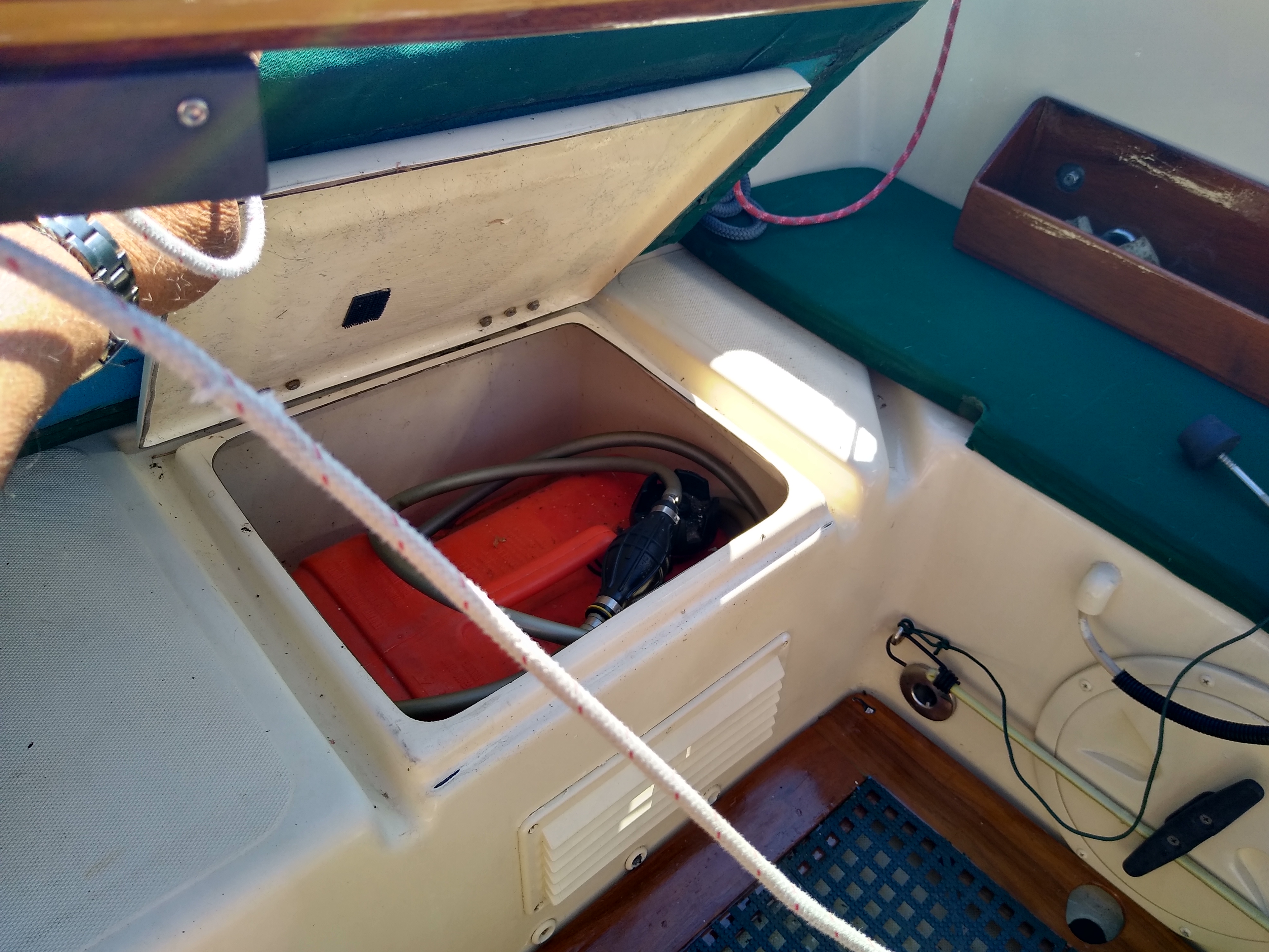Forgot this part of the question... I keep a small gas can at stern end of cockpit footwell, if I'm just lake sailing. Totally out of the way there, neither skipper nor passengers if any will be sitting that far aft. I have a 3-gallon that I haven't had need for yet but would put it in same location. My M17 is early version so has no sealed locker aft so can't put it in there. There was a ledge & cover/seat added to the rear of the cockpit seats on the boat I acquired - wood strips on sides & rear & piece of ply sitting on those, flush with seats. Paint was peeling etc. so I pulled them off, but will put them back eventually in nicer shape. The ledge/seat provides visual and sun cover for the gas can or tank. cheers, John On 5/20/20 5:41 PM, Henry Rodriguez wrote: