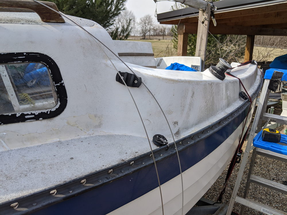 Tim, I only count 5 cleats on the boat, one on the bow and two on the top of the cockpit coaming (if I am using the term correctly) on either side of the boat, one just aft of the winch and one towards the stern. I assumed that the cleats just aft of the winches were meant to secure the jib sheet on a particular point of sail. Other boats I have sailed typically have a v-cleat or cam cleat instead of a "yacht" cleat for securing a jib sheet. There are two pulleys (fairleads?) on each side of the boat, one about even with the rear of the cabin and one about even with the cleat just aft of the winch. These are tied to the perforated toe rail with 3 strands of small line. I assumed that the forward ones were used to lead the jib sheet towards the winches, which is how I planned to use them. I'm not sure what the rear ones were used for. The attached photo shows the positions of the two pulleys and cleat on the port side. Regards, Rob On Wed, May 20, 2020 at 8:23 PM TIm Brown <tim-brown@sbcglobal.net> wrote: