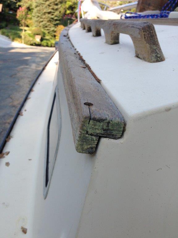 I have several areas where I have water staining. I am planning on taking off the deck top items and re-bedding them. Seems like a major portion of the leaking is coming from the port lights and top of the cabin corner where the teak corner rail is attached (see attached picture). It looks like this piece of teak is in two pieces and screwed together. Does anyone have any experience removing this teak trim? Any advice? Looks like removal of the port lights is pretty straight forward. Unscrew the interior frame and take them apart, clean and then re-bed?