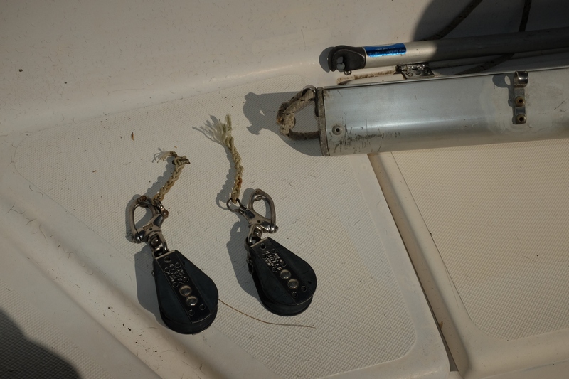 The two blocks with the snap shackles are the jib/genoa sheet lead blocks. They attach through the various slots in the aluminum toerail, and can be moved more forward or aft to adjust sail twist.