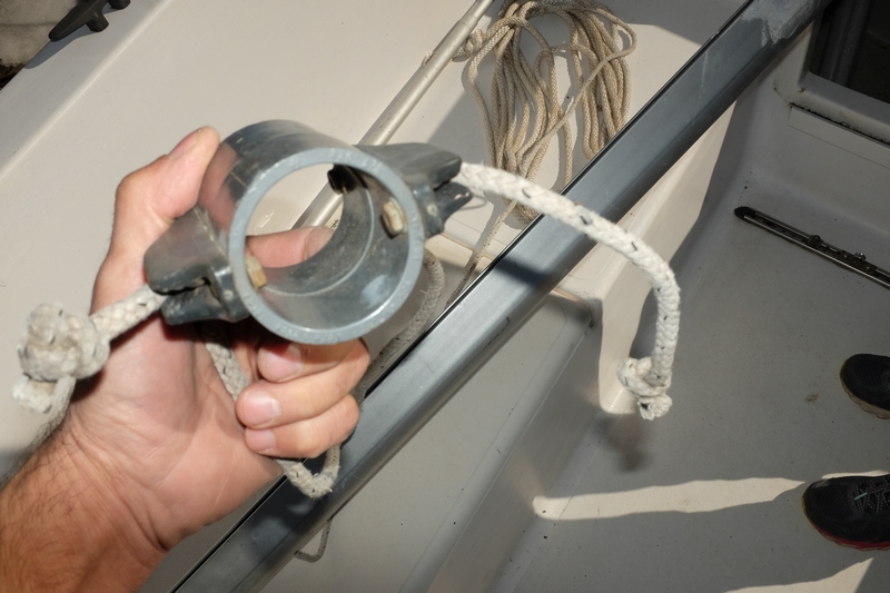 OK, I'm learning by leaps and bounds here. I really appreciate the help. It makes more sense now that I know the opening was already lowered. So then the gooseneck would be inserted and raised up a bit in the mast...but where would that line from the gooseneck have been anchored to keep the boom down (resisting the sail and halyard pulling up)? I'll attach a couple more photos to show more.I found what I assume is the mainsheet with two blocks. I'm guessing the larger block with cam cleat attaches to the traveller on the forward cockpit sole, and the single block goes on the eye about midway on the boom. Correct? And how would the jib sheets be run back on the M17? I did find 2 separate single blocks; I'm not sure where they were used. I also have a telescoping forspar; it has what a would call a probe on one end and a clip on the other end. Gee, I'm almost ready to drop the mast again, install the halyards (I found 2), raise the mast again and hoist the sails. Then I can take real measurements for the new mast. Oh, there was also a custom whatsit in a locker (see photo). It's made from a pvc glue in coupling and two jam or V cleats; any idea what this was for?