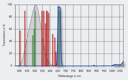 From website: <The red lines are the most important lines from artificial light pollution. <The green lines are the most prominent emission lines for nebulas. The grey <curve is the human eye´s night-sensitivity. The blue line is the <transmission curve of the Ha filter.