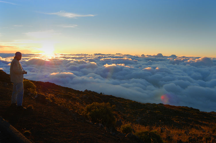 Hi Deb I can walk out to the front walk of the house, look past the glare of the street light and see the Southern Cross standing upright and this is about 5AM. It gets to be alot better in the spring when the nights are warmer and the Crux is visible at 10PM and by mid summer we're chasing it to the horizon. Eta carina and Omega centauri are right there too. The Milky Way looks like a cloud in the night and at times I swear it's casting a shadow. The only light source that is a bother is from passing cars as they return from Hana (stops after 10PM) and a marine beacon at Cape Kumukahi on the Big Island about 70 miles or so away. We usually tune in a local station from Kona that plays Hawaiian music (slack key guitar!!), break out the vanilla macadamia coffee and some sweet treats and make a night of it. we are looking for a spot to make a permanant site where we can install a few piers and some facilities. The other spot we have is on Mt.Haleakala at the Kalahaku parking lot (9324') and I have made a place to install a pier there. It also has a rest facility that serves as a warming hut when it gets cool and breezy,no water or power though. Either place is great for southern skys. We were at Kalahaku when Mars made it's closest aproach, we had several scopes up there and about a dozen people turned up to see Mars. Our 1st unofficial star party of HAA (Haleakala Amateur Astronomers). Here's a photo of my friend and observing buddy Robert at the Kalahaku site just before sunset. aloha Rob